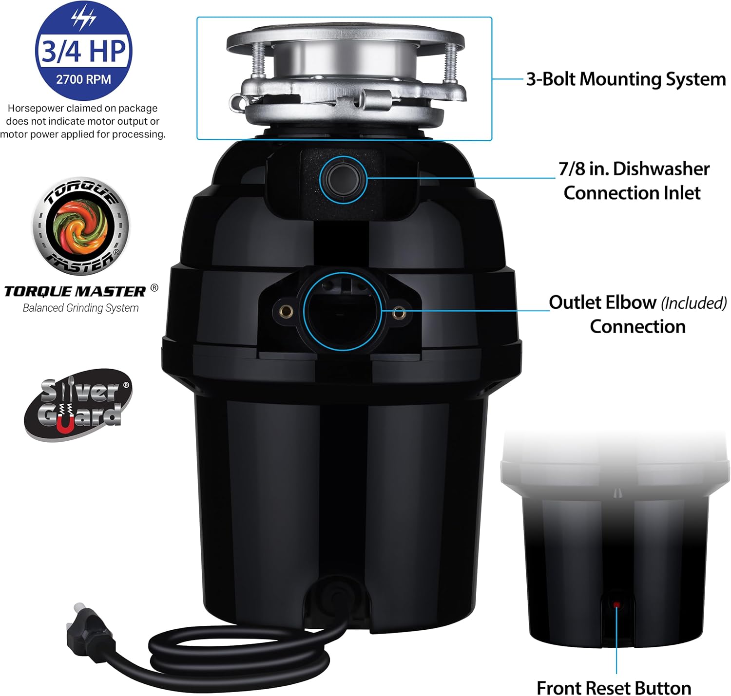 Waste Maid 10-US-WM-458-3B Garbage Disposal Anti-Jam Stainless Steel Food Waste Grinding System, 3/4 HP Deluxe, Black