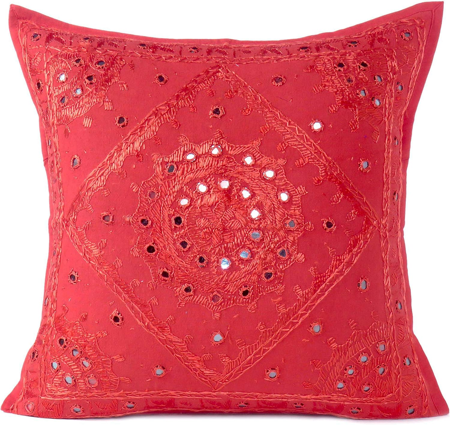 Eyes of India Embroidered Decorative Boho Throw Pillow Cover with Mirrors, Handmade Bohemian Accent Cushion Case for Sofa Couch Bedroom Living Room (Red, 16" x 16")