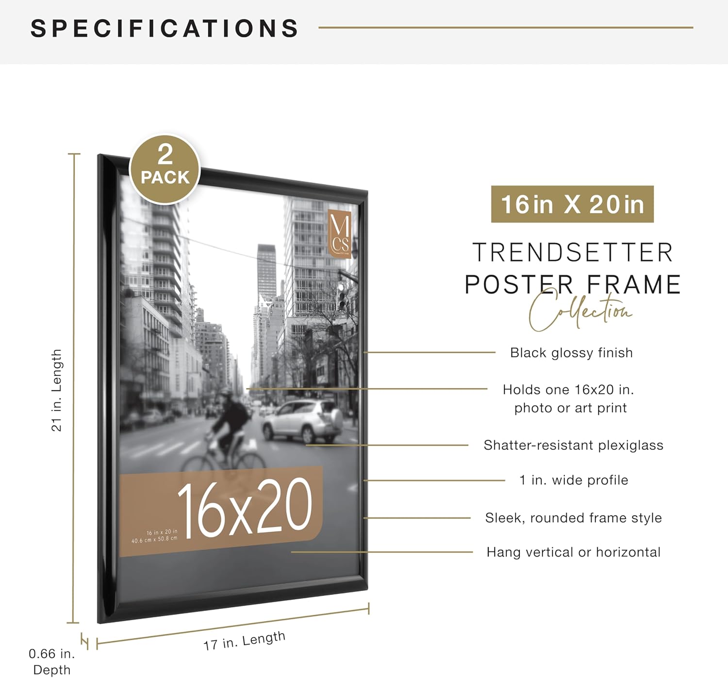 MCS Trendsetter 16x20 Poster Frame Black High-Gloss, Vertical & Horizontal Wall Hanging Large Picture Frame for Photos, Posters & Art Prints (2-Pack)