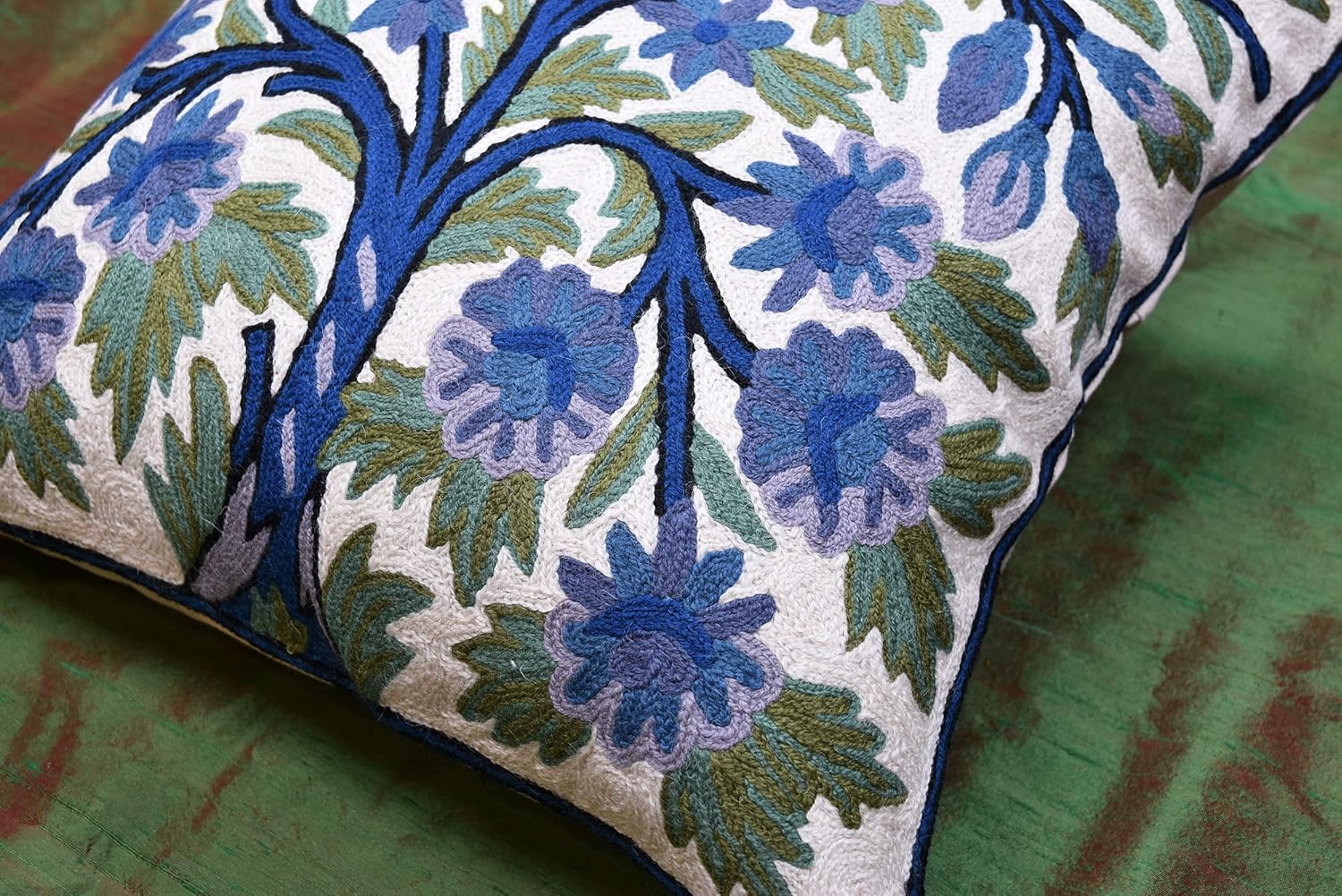 - π HAND EMBROIDERED PILLOW COVER: These unique decorative accent tree of life pillow covers are hand embroidered in soft wool, stitch by stitch by the finest artisans by hand, creating an extraordinary show piece for your decor. A close-up view of this floral accent pillow cover allows you to see the amazing chain-stitch hand embroidery work done by the master artisans. The entire front of the suzani floral pillow is covered in hand embroidery.