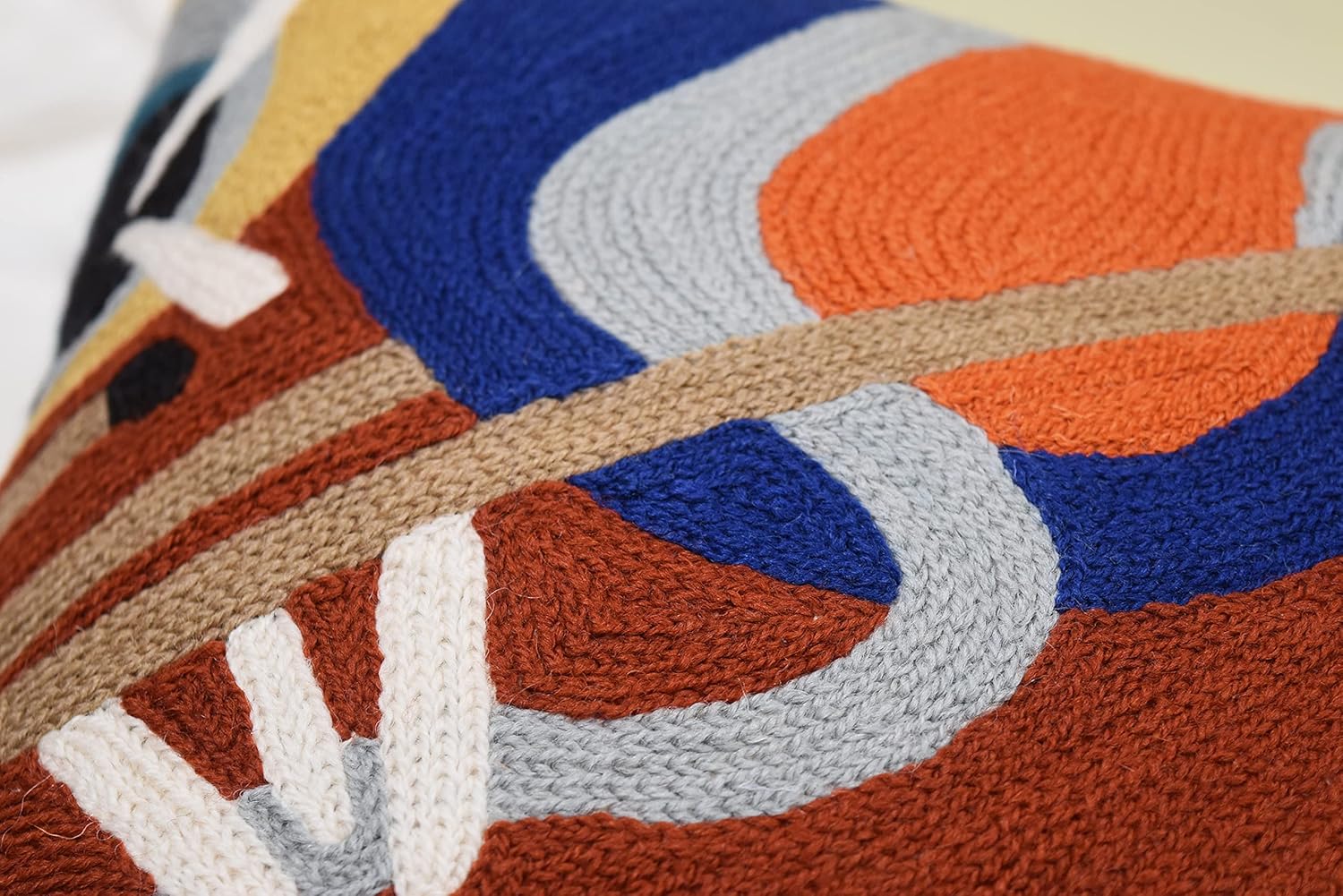 - π MODERN THROW PILLOW COVER - HAND EMBROIDERED: These colorful decorative modern throw pillow covers are inspired by the art of Kandinsky and are hand embroidered in soft wool to perfection, stitch by stitch, by the finest artisans, creating an extraordinary all modern abstract pillow for your home decor. A close-up view of this all modern accent pillow cover allows you to see the amazing fine chain-stitch hand embroidery. A perfect modern sofa pillow for your contemporary couch.