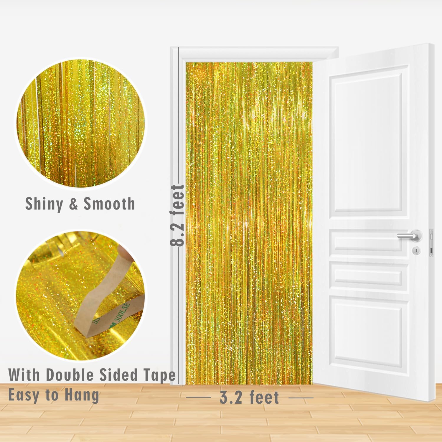 - Package Includes:2 pack shiny gold foil fringe curtains,3.2 ft x 8.2 ft each,suitable for hanging on a door or coverage a wall fully