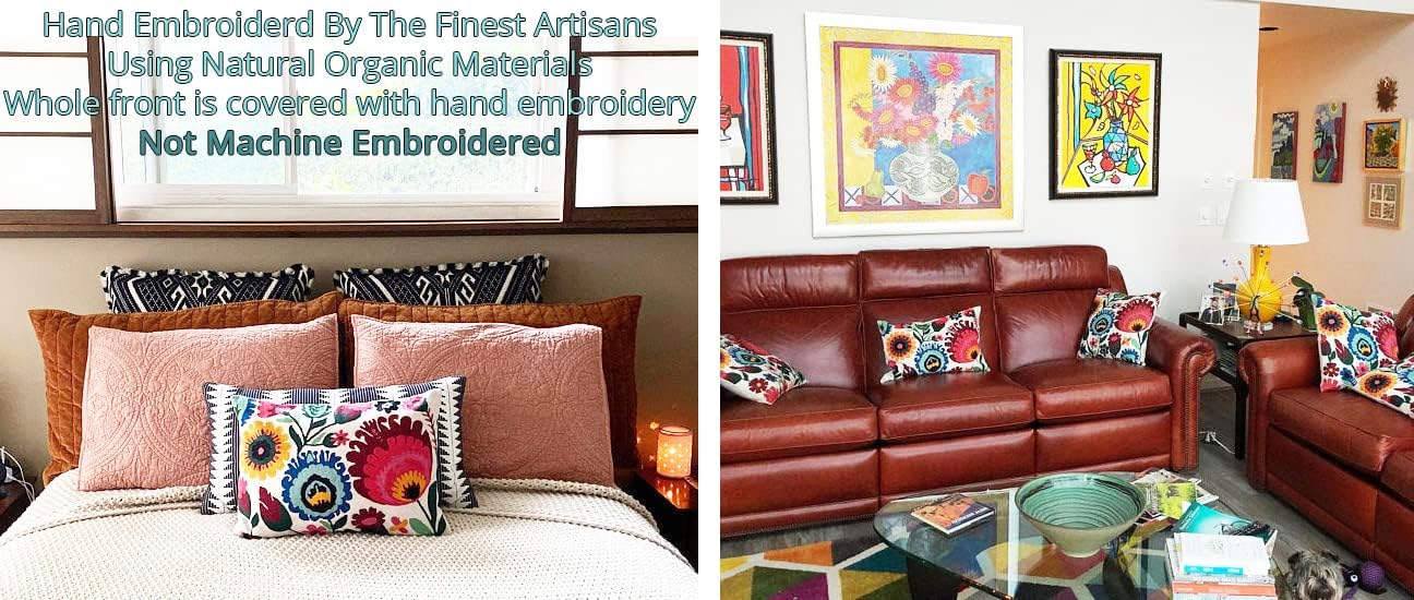 - πΊ DAZZLING CHAIN STITCH DETAIL: Revel in the fabulous allure of our hand-embroidered suzani art nouveau floral accent pillow. The colorful design injects life into any transitional or modern-style home or office. Transform an old throw pillow or embellish a new pillow form, creating a unique farmhouse pillow that stands out. From patio to living room, den to bedroom, study to kids room, these eye-catching floral art pillows refresh your home decor with their dazzling chain-stitch hand embroider
