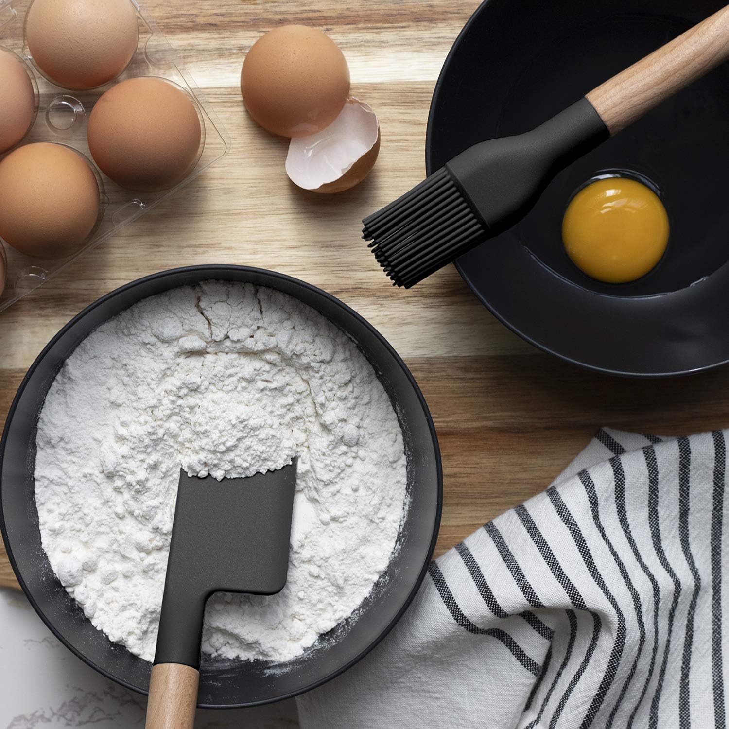 - Equip your Kitchen with all the essential baking tools and cook, bake, and serve with fun and fashion at the same time, this colorful and stylish set features black silicone utensils with easy to grip wood handles. Hand wash recommended. BPA free; heat resistant up to 450Β° F. Hand wash only.