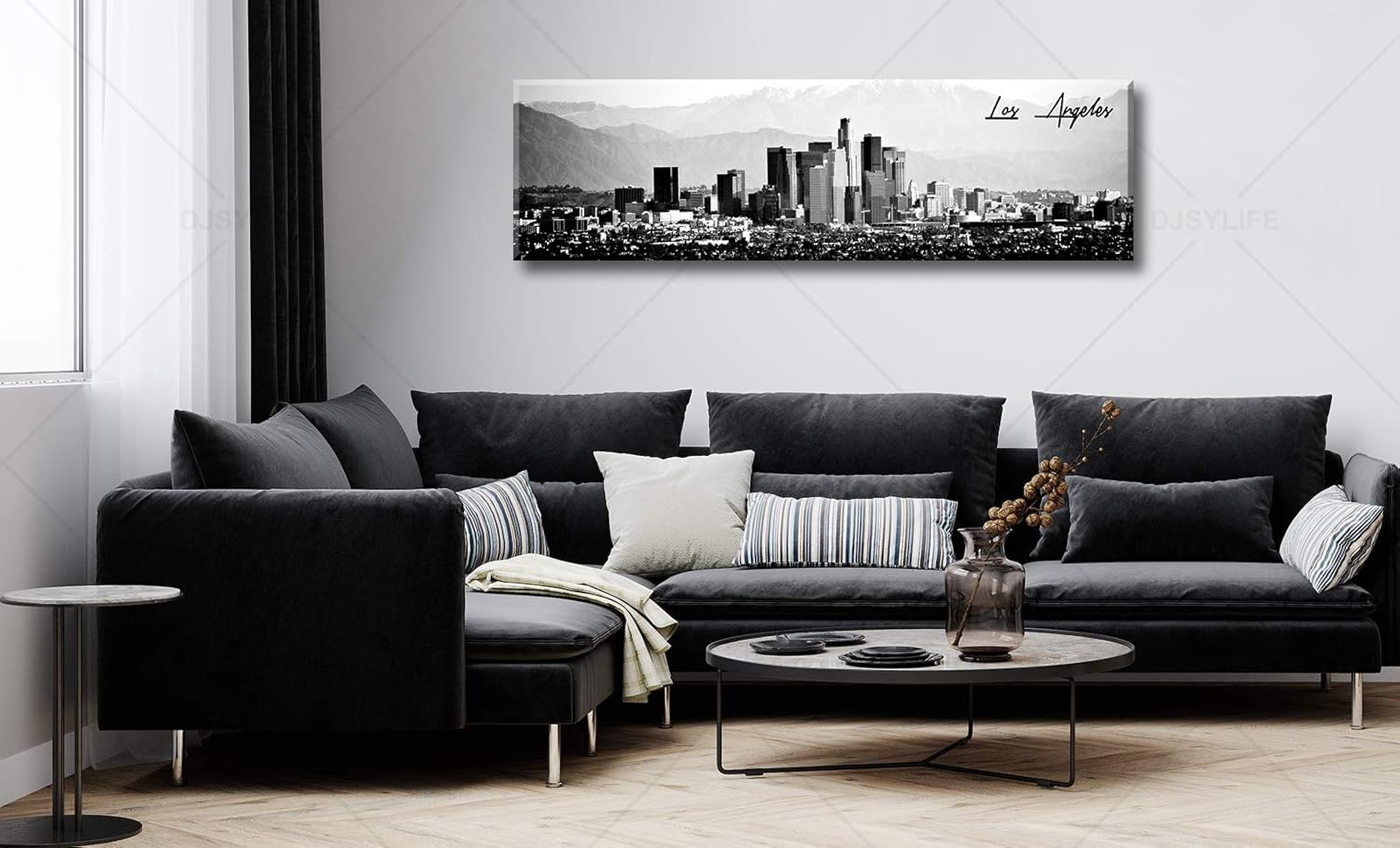 DJSYLIFE Los Angeles Skyline Wall Art Black and White USA Panoramic Cityscape Picture Canvas Prints Artwork for Bedroom Men Room Office Decoration Painting Ready to Hang 13.8"x47.3"