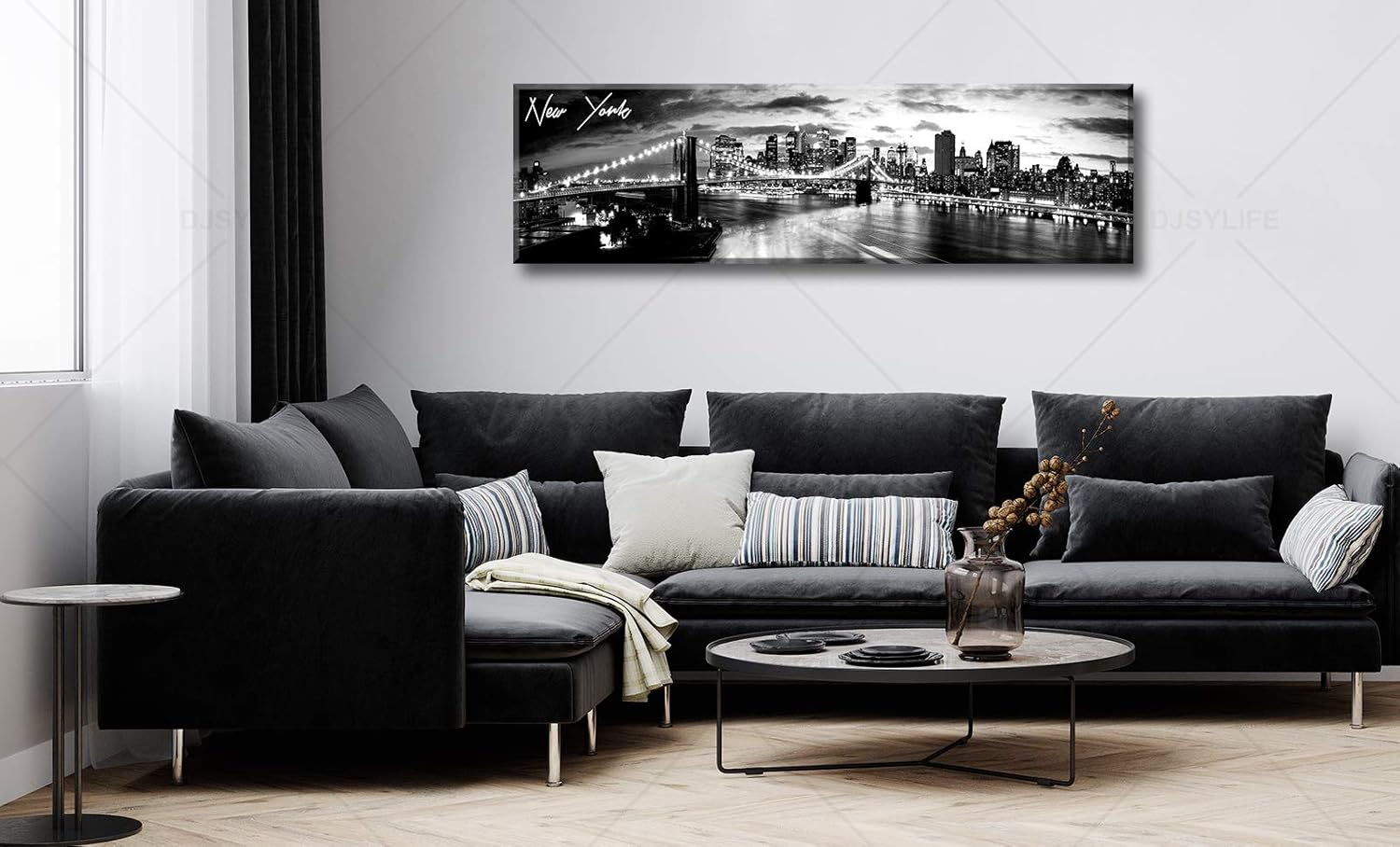 DJSYLIFE New York Skyline Wall Art - Brooklyn Bridge Night View - Black and White Nyc City Pictures Scape Artwork Painting Decoration for Bedroom or Office, Ready to Hang 13.8"x47.3"-New York1