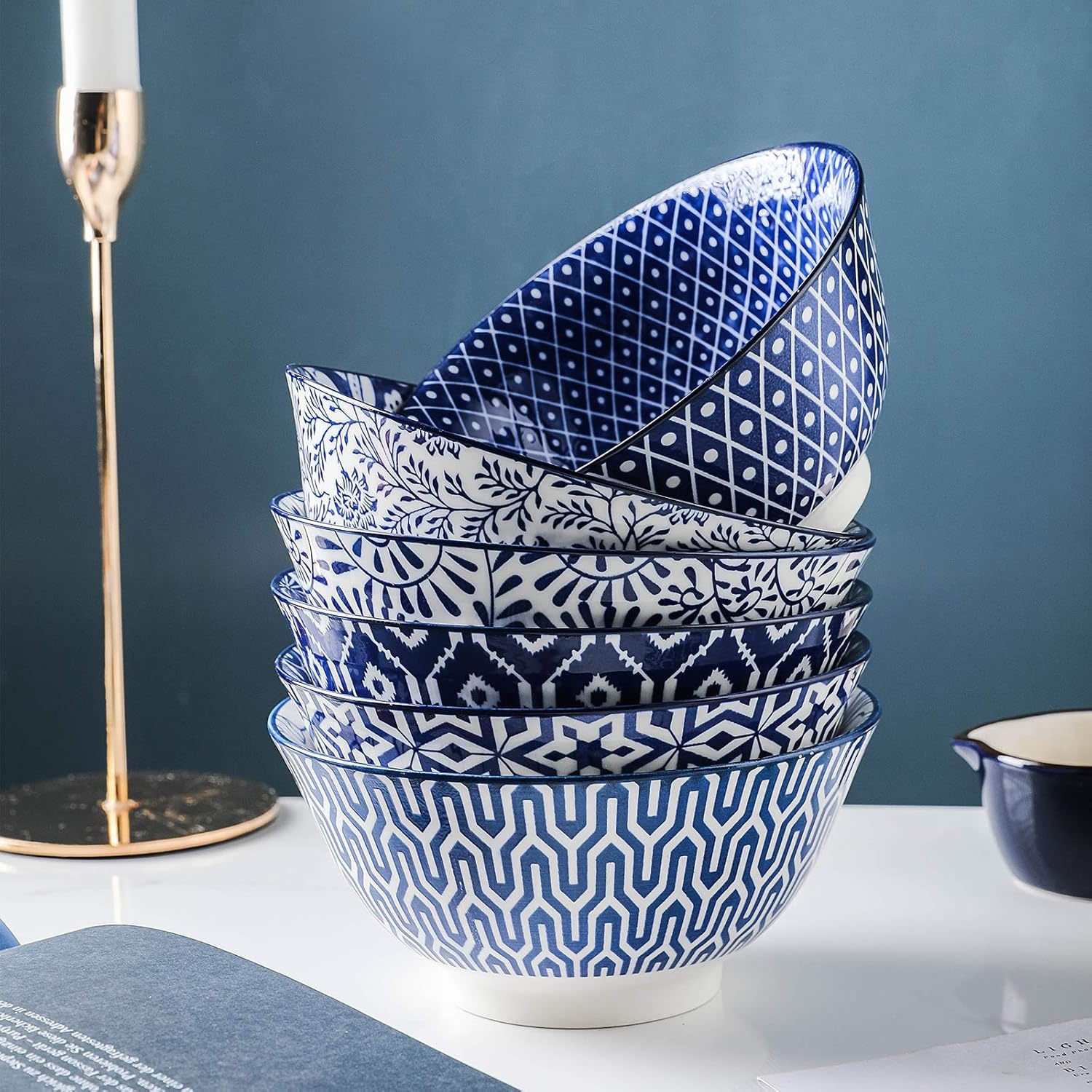 Selamica Blue and White Porcelain 20oz Cereal Bowl Set - Set of 6, 6 inch Soup Bowls, Ceramic bowls for Cereal, Soup, Salad and Pasta, Vintage Blue