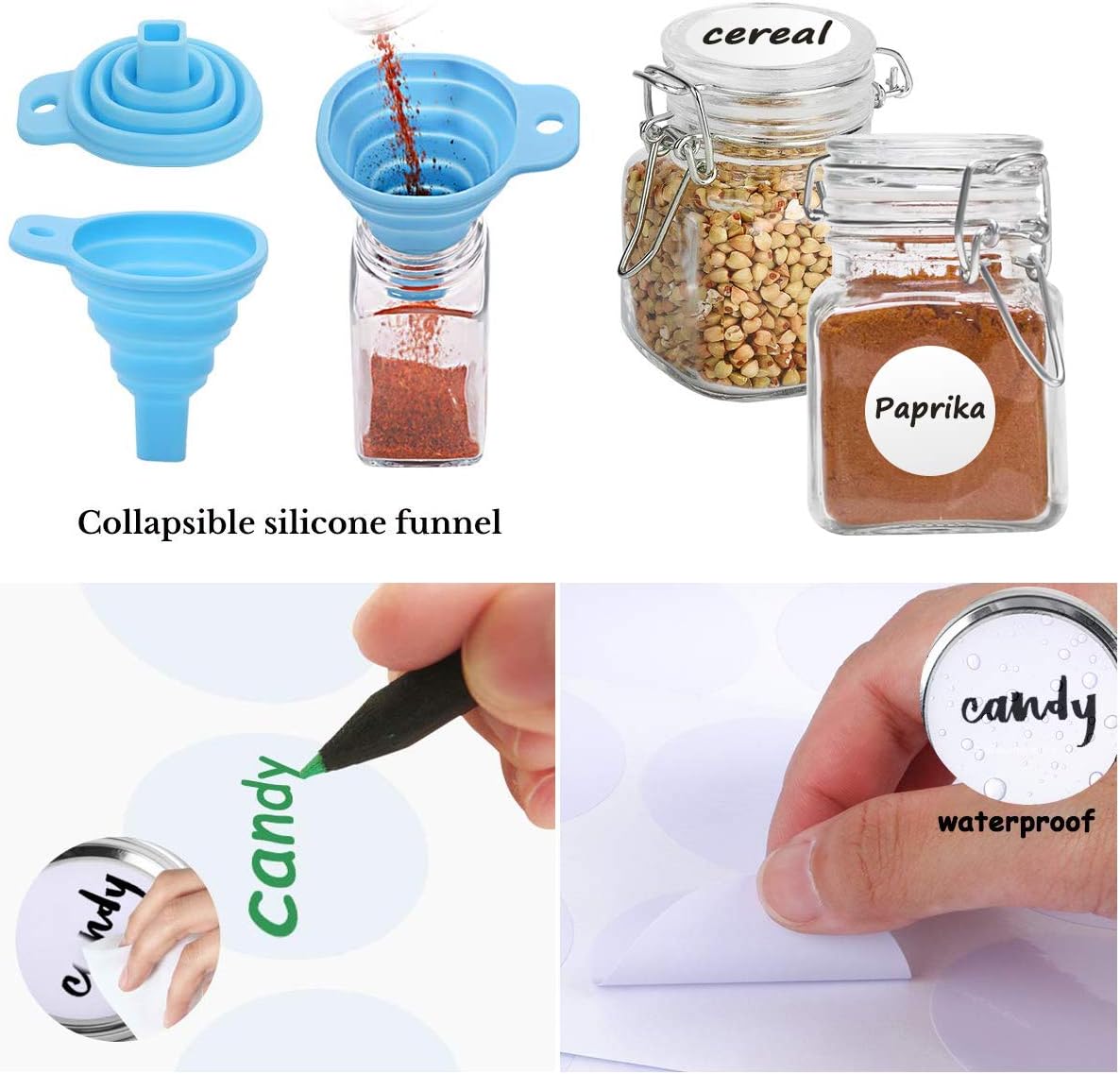 - Premium Quality Spice Jars - 12 Pack 4 oz Mason Spice Jars Set with Airtight Hinged Lids and Rubber Gasket,which is made of the highest quality materials for maximum durability and convenience. Each set come with 12 Spice Labels & Silicone Funnels.