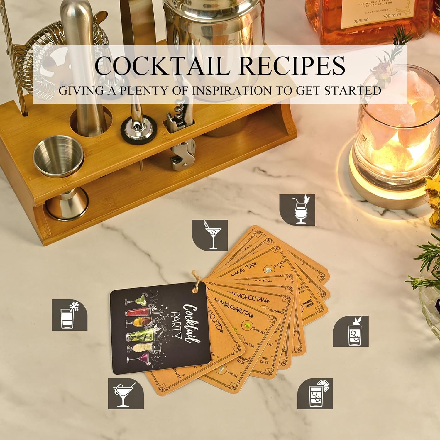 - Ideal Gift for Cocktail Lovers: Beautiful bar cart accessories, bamboo holder and cocktail recipes packed together with a pretty gift case, giving a plenty of inspiration to get started, even a beginner! A pretty gift for lover, family, friends, colleagues