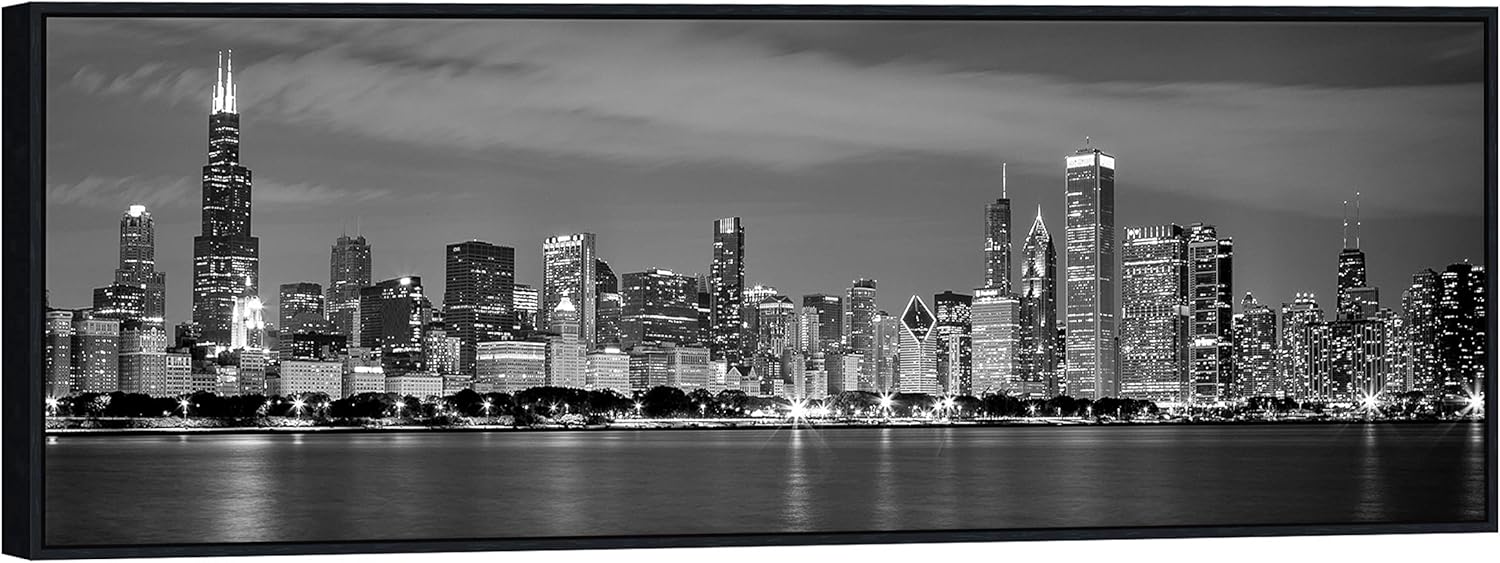 Wieco Art Framed Wall Art Chicago City Center Skyline Black and White Wall Decor Canvas Prints Modern Cityscape Wall Decorations for Living Room Pictures for Bedroom Decorations