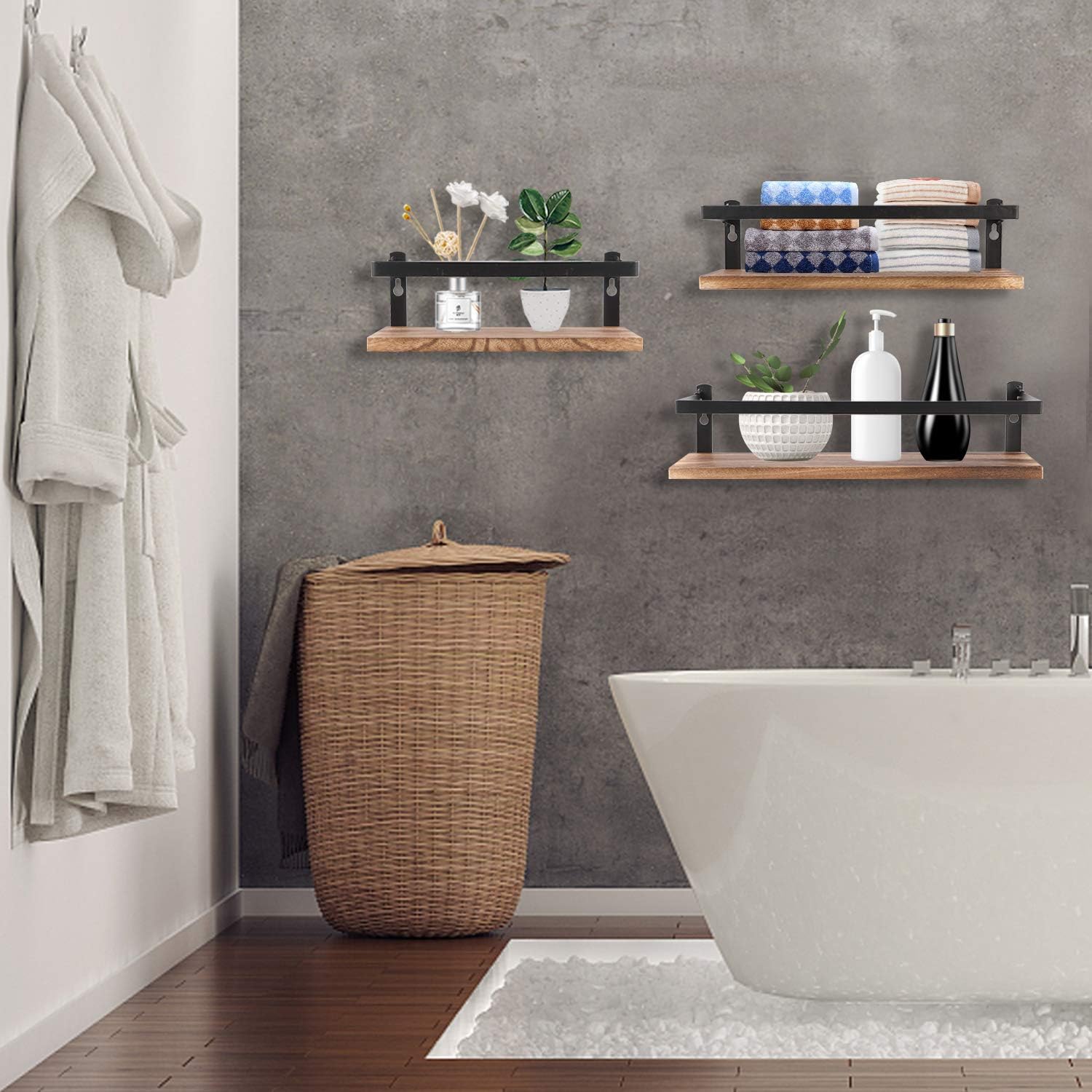 Floating Shelves Rustic Wood Wall Mounted Shelf Practical Metal Fence Design Ideal for Bedroom, Bathroom, Kitchen Set of 3(Carbonized Black)