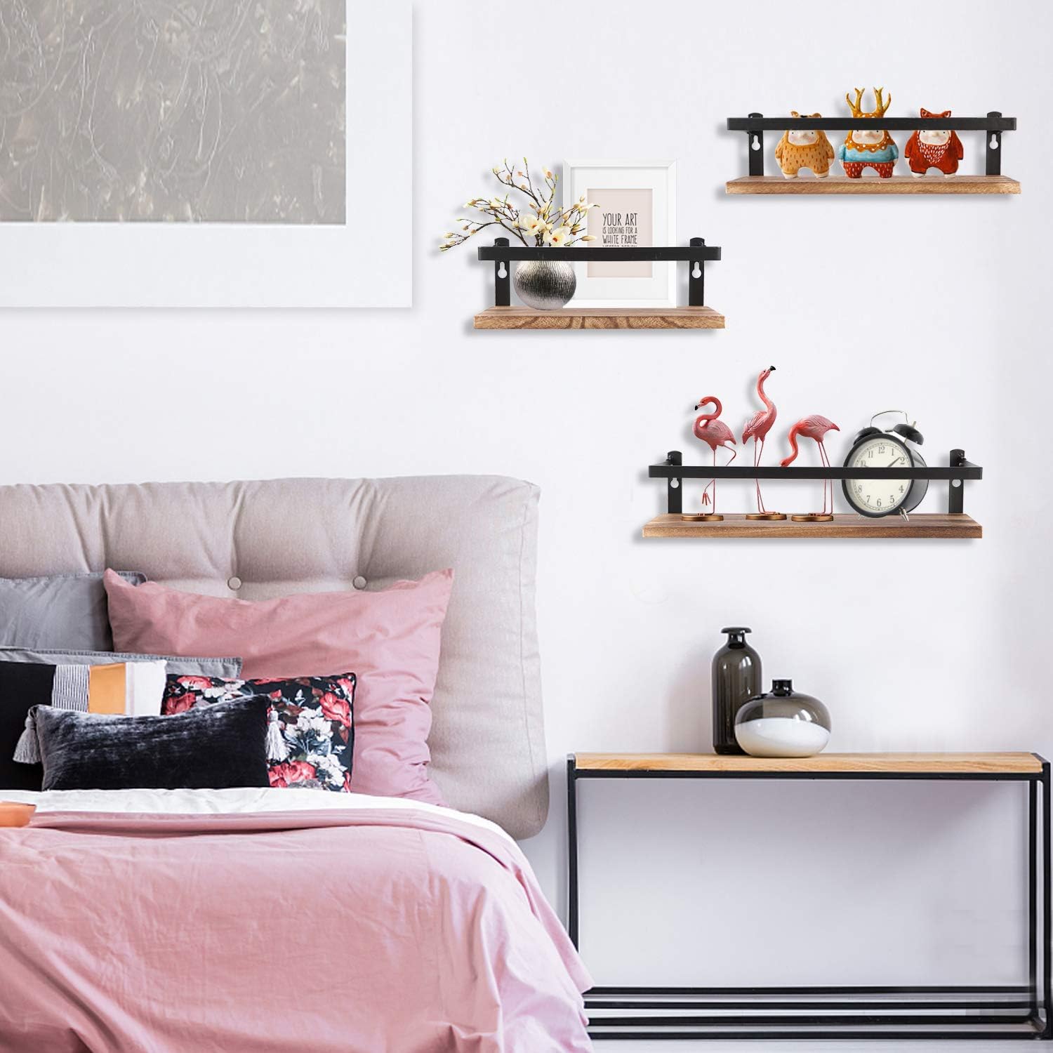 - ăINNOVATIVE DESIGNă: Unlike similar products on the market, these wooden shelves for wall come with a unique design which includes a metallic fence, preventing your delicate items from dropping and breaking! By special process,the fence is ,it wonât be scratched by long time use and always looks grace.