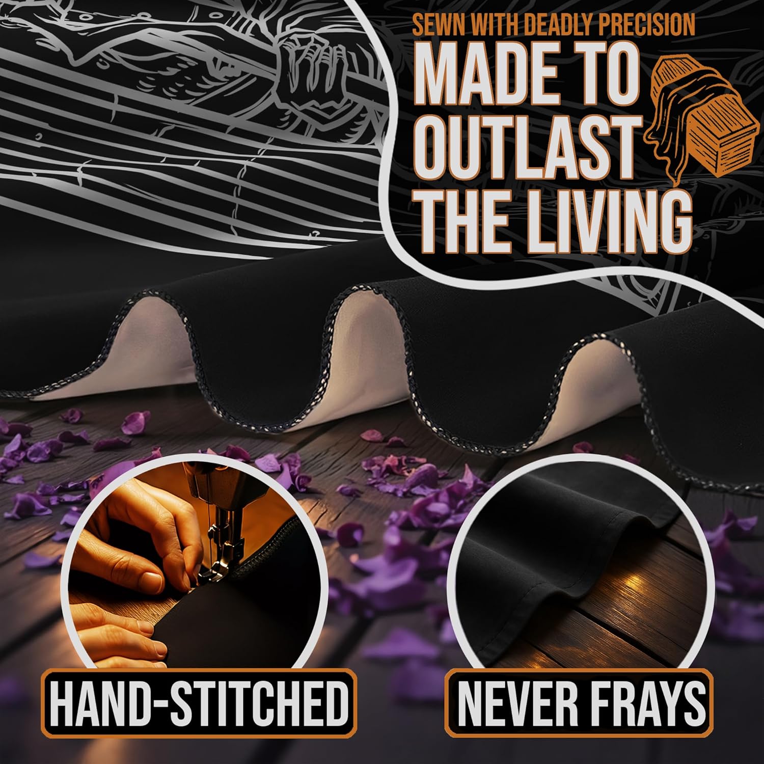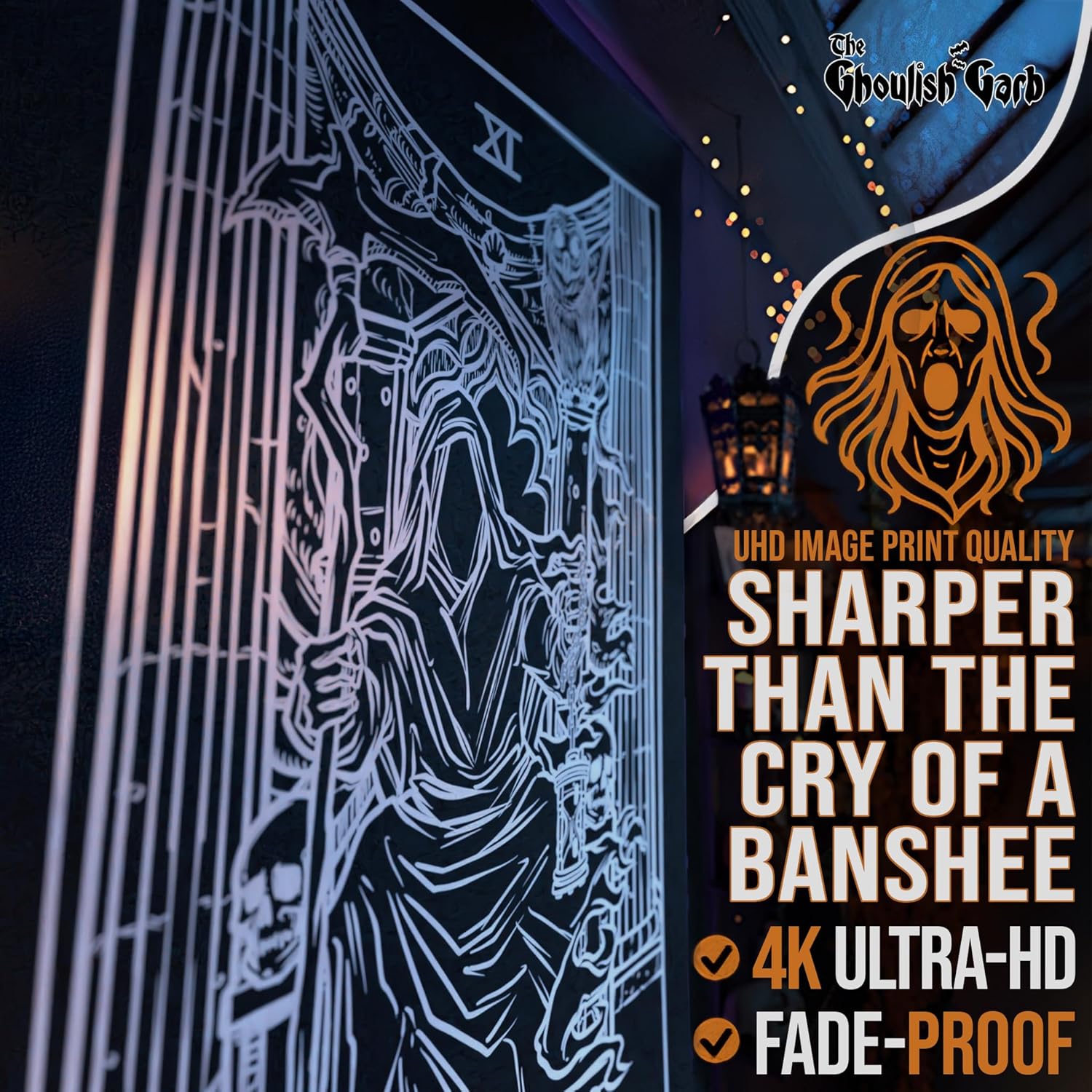 The Ghoulish Garb Justice Tarot Card Tapestry (Black & White) - Grim Reaper - Gothic Halloween Home Decor Wall Hanging (60" x 50")