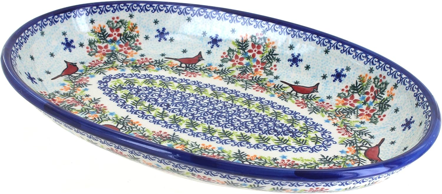 Blue Rose Polish Pottery Winter Cardinal Oval Platter