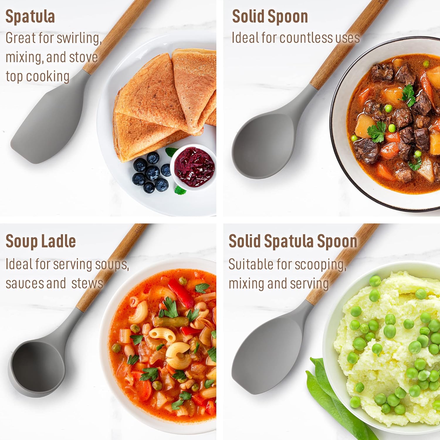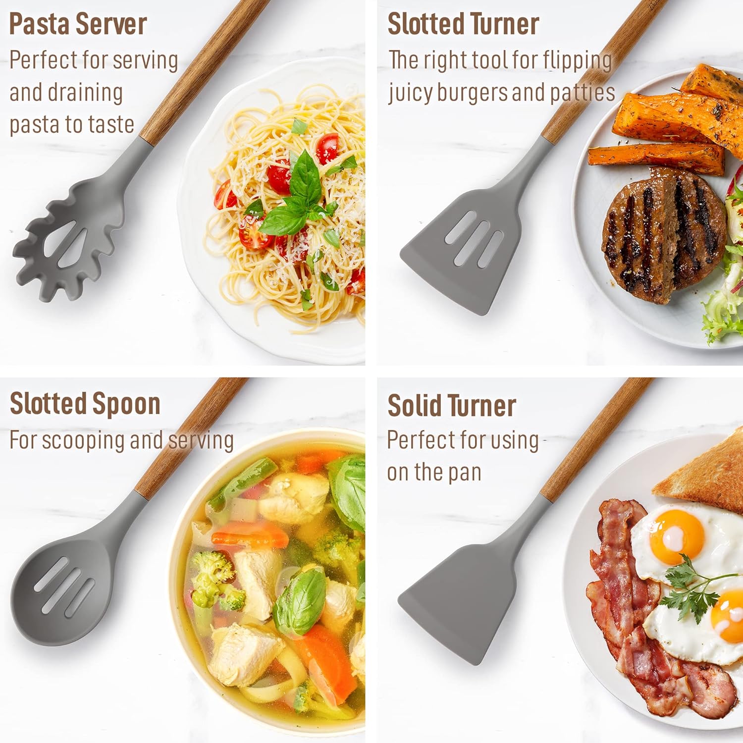 - Perfect For Your Non-stick Pots And Pans: Protect your precious cookware by using these silicone cooking utensil set designed with soft, non-scratch silicone to prevent scratching pots and pans when cooking. Engineered for the right mix between the flexibility of silicone and the stability of wood, making it sturdy, functional, and comfortable to use. Includes a solid spoon, slotted spoon, slotted spatula, solid spatula spoon, solid spatula, solid turner, pasta server, and ladle.