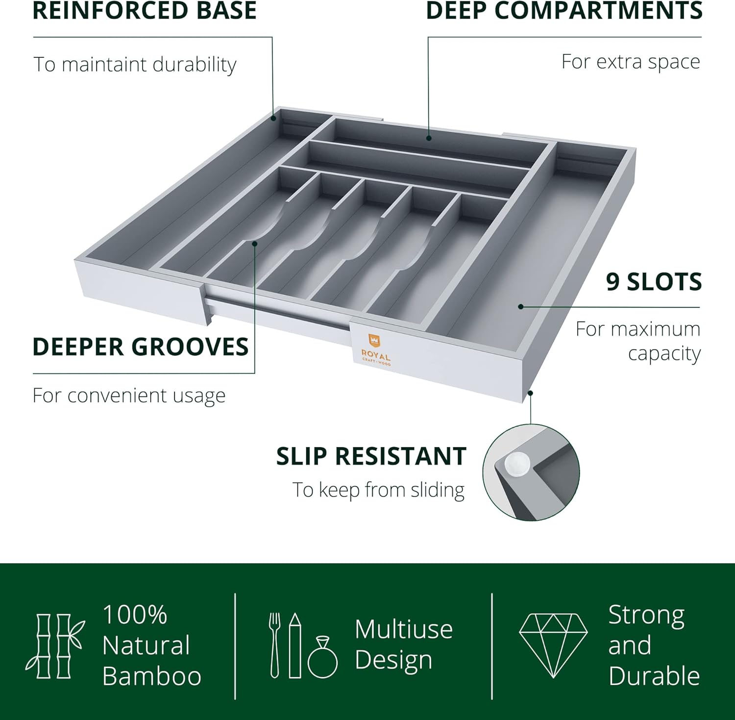 - ππππππππ ππ π ππππππ ππππ πππ πππππππ ππππππ: Our cutlery organizer is not only great for storing flatware, but can also be used as a kitchen drawer organizer for large utensils such as spatulas, spoons, ladles, and more. Find all your kitchen gadgets in one spot, completely hassle free, thanks to the storage containerβs deep compartment walls. Take advantage of our beautiful bamboo organizers expandability and 9 main compartments