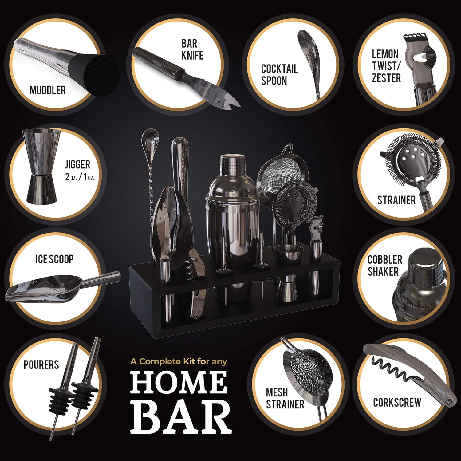 Highball & Chaser 13-Piece Cobbler Cocktail Shaker Set: Black Polished Stainless Steel Bartender Kit for Home Bar Set | Laser Engraved Tools Plus E-Book with 30 Recipes