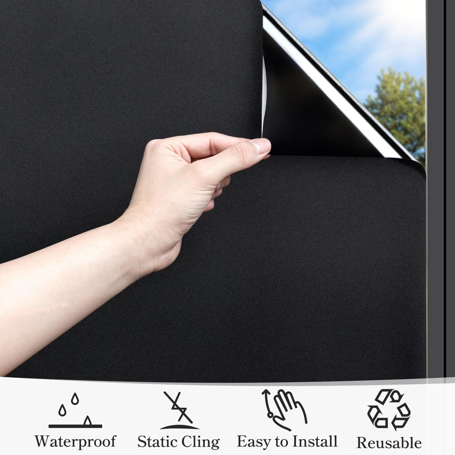 DUOFIRE Blackout Window Film Completely Light Blocking Privacy Window Film Room Darkening Frosted Tint Films for Day Sleep, Non Adhesive Static Cling Films DT-C009 (17.4 x 118 Inch)
