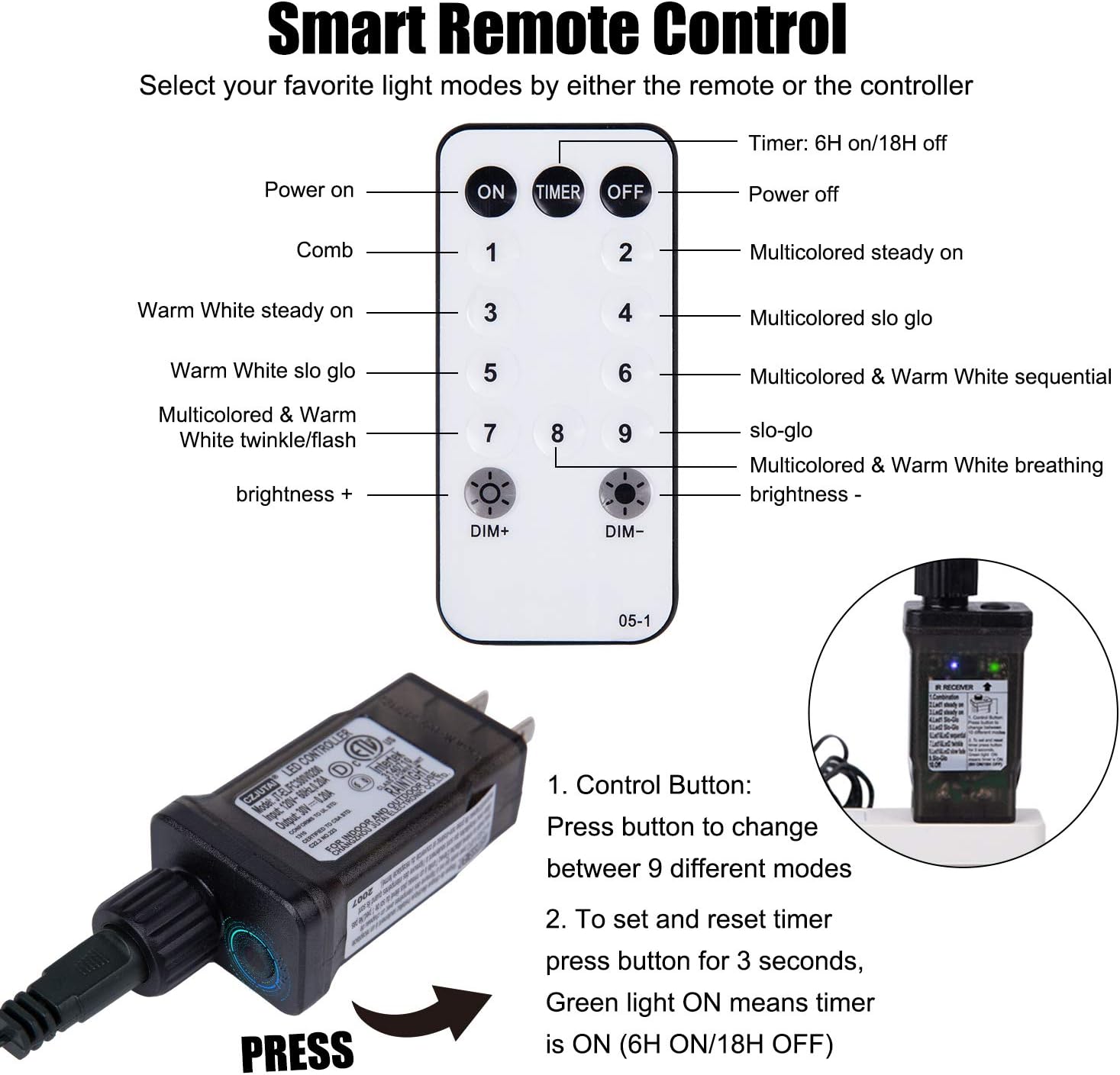 - Timer & Regulable Lighting & 8 Mode Lighting: These Christmas lights indoor have 100%-75%-50%-25% 4-level brightness and 6H on, 18H off time function. And the built-in memory chip will save your last mode setting, so there is no need to reset! These twinkle lights have 8 fun settings where you can choose various flickers or constant on option. These 360ΒΊ sparkling warm white & multicolor lights can not only provide good lighting effects but also bring a more romantic festive atmosphere
