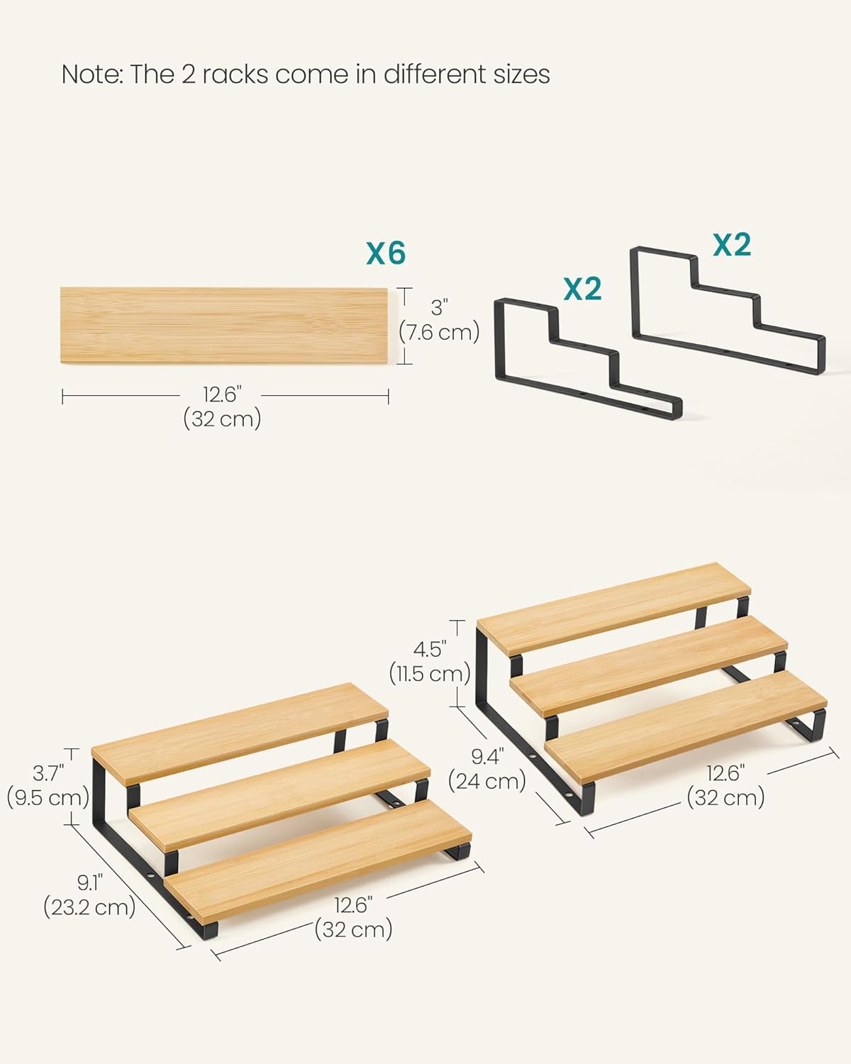 SONGMICS Display Risers, Set of 2 Engineered Wood Perfume Organizer Stand, 3-Tier Cupcake Stand Holder, Spice Rack, Shelf Risers for Figures, Dessert Shelves, Natural Beige and Ink Black UKCS016N01