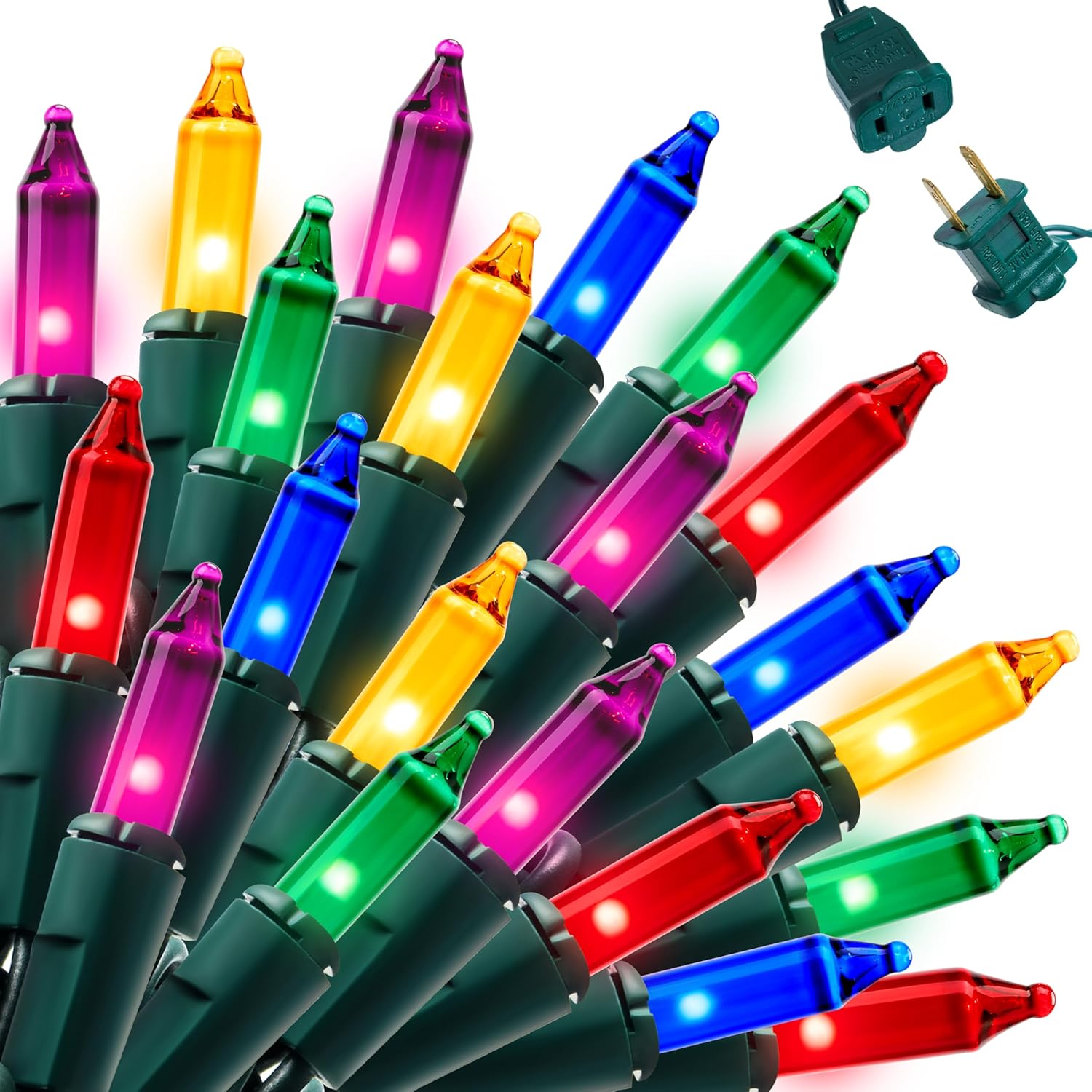 - 3 Pack 100 Multicolor Bulbs with Flasher Effects.Create a vibrant, traditional holiday glow with 300 warm multicolor bulbs. Each set has 21.4 feet wire length and 19.4 ft lighted length with 2.36 inch light spacing.Come with 6 extra bulbs & 3 replacement fuses & 6 testing flasher bulbs total., eye-catching effects to your display. The classic look is ideal for Christmas tree decorations and nostalgic holiday cheer.