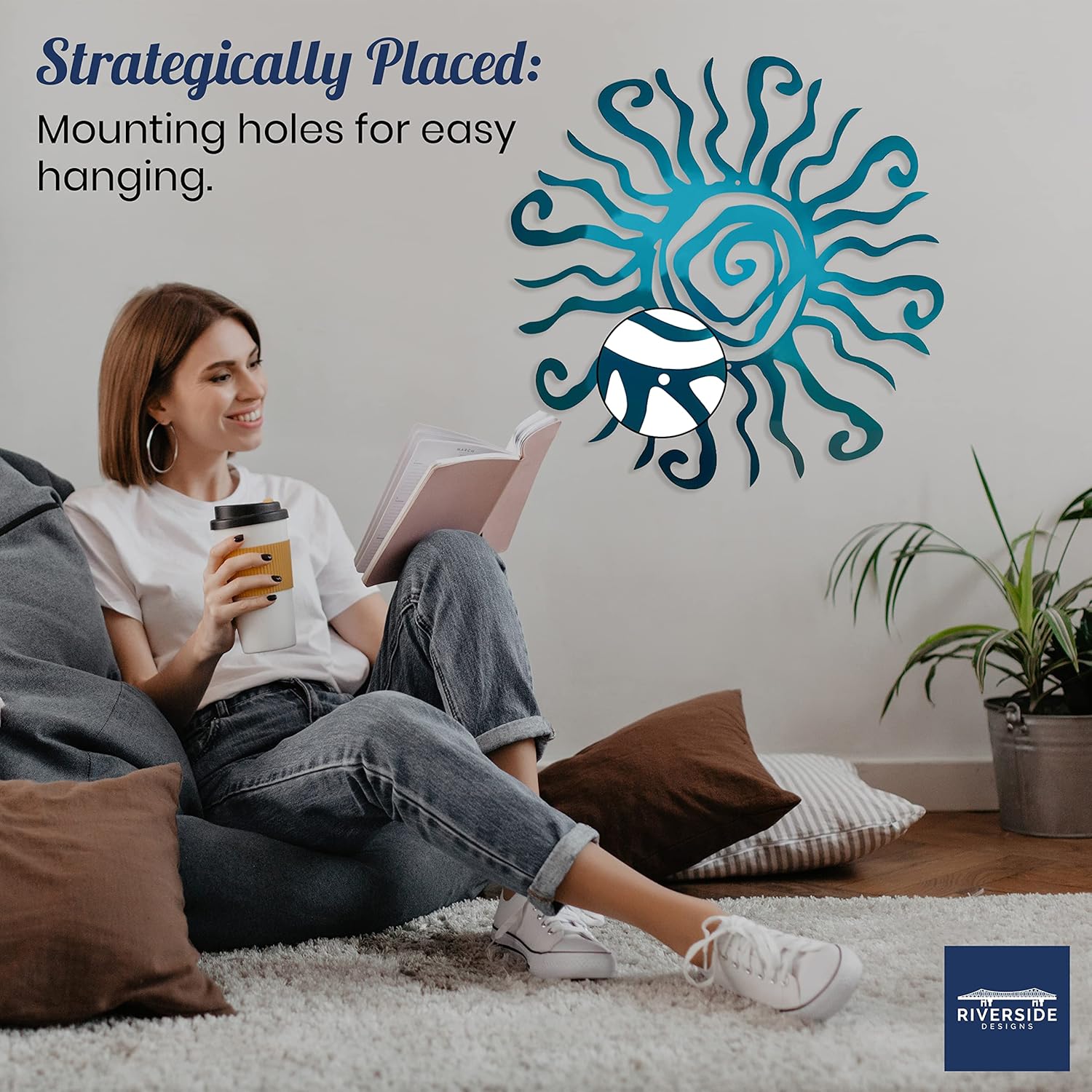 Riverside Designs Wacky Sun Metal Wall Art Indoor/Outdoor Decor - 36" Teal Rust Proof Wall Sculpture - Made in USA - Ideal for Bedroom, Garden, Home, Patio and Farmhouse