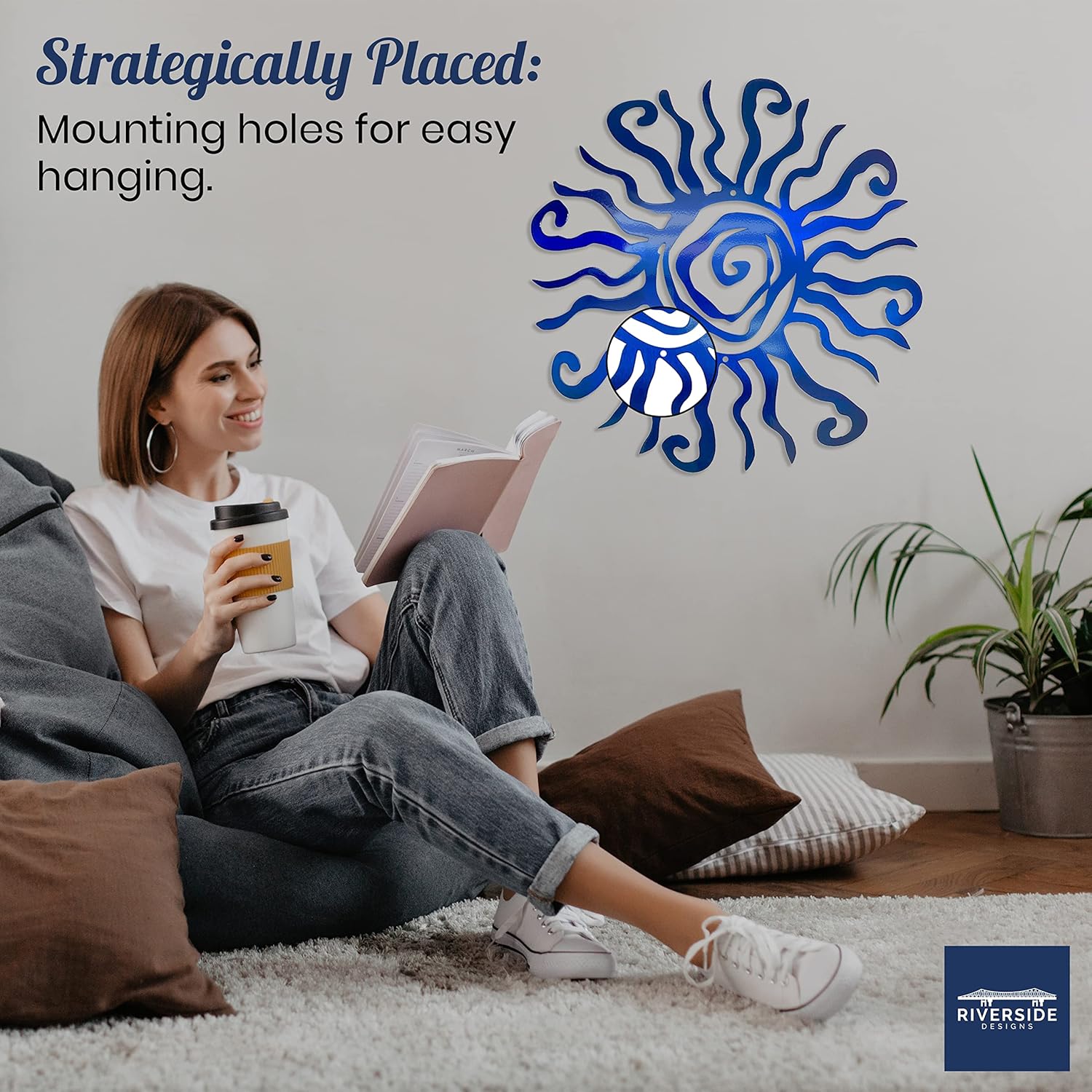 Riverside Designs Wacky Sun Metal Wall Art Indoor/Outdoor Decor - 24" Blue Rust Proof Wall Sculpture - Made in USA - Ideal for Bedroom, Garden, Home, Patio and Farmhouse