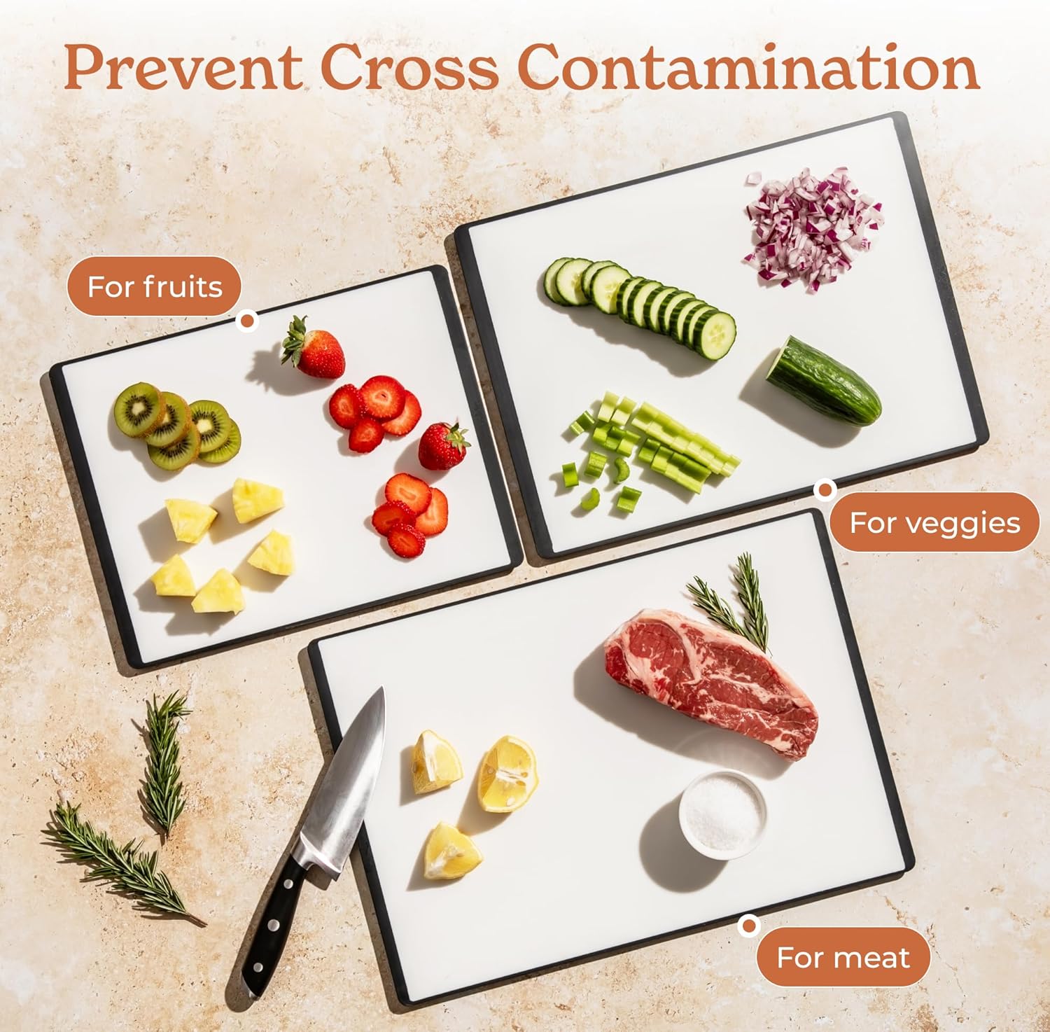- 3-Pack with Holder: This cutting board set includes small, medium, and large cutting board sizes for every prep need. It also comes with a compact holder that neatly organizes all boards vertically, keeping your countertops clutter-free while ready for any chopping task.