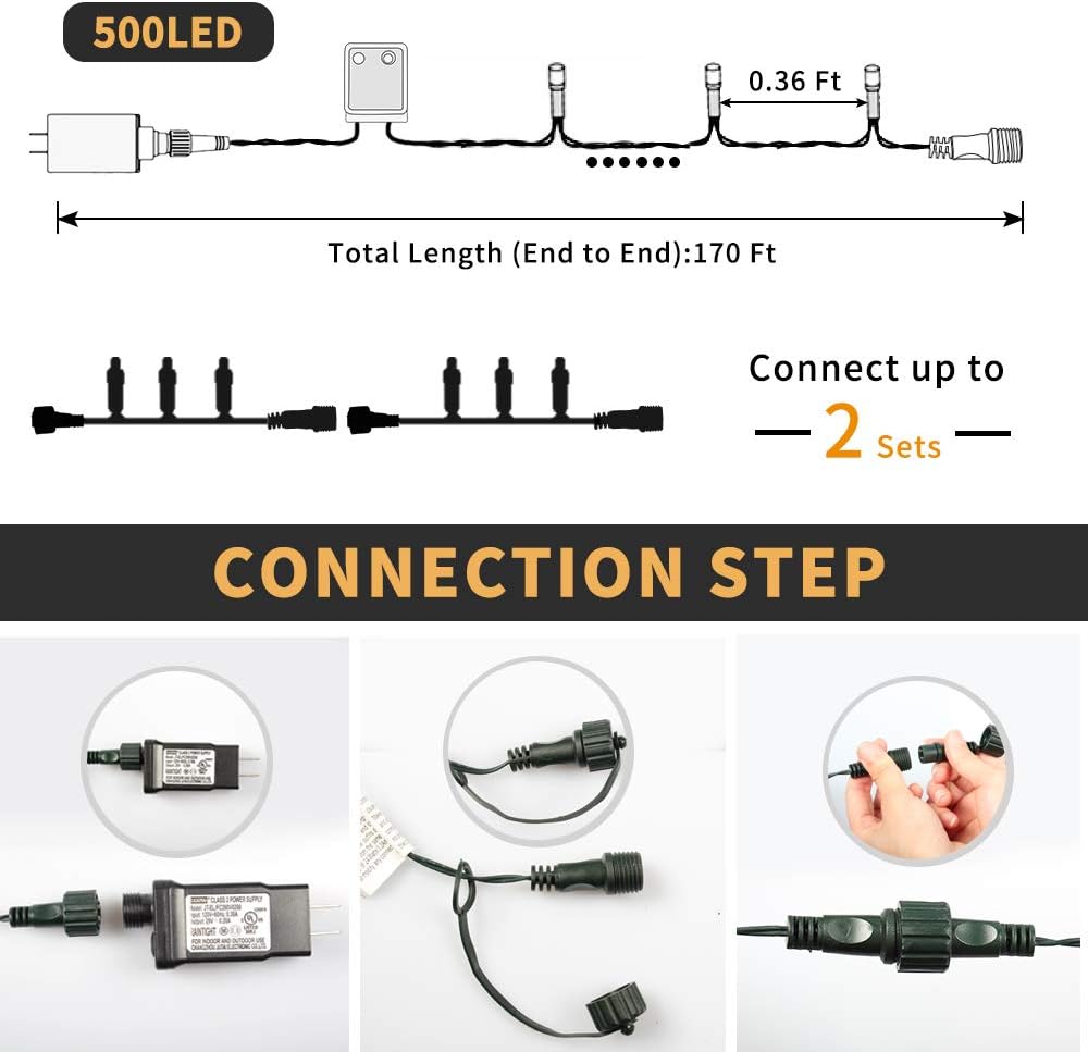 - 165FT/500LED & End To End Expandable:This super long 165ft fairy string lights with 500 individual LED bulbs. And each Christmas light has end-to-end connection that allows up to 3 strands connected together to illuminate a wider range, so the max expandable length is 495 feet, 1500LEDS for larger area. They will brighten up the dark corner for happiness atmosphere inside or outside.