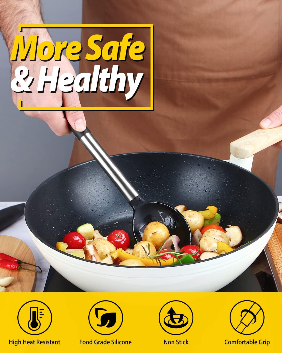 - More Safe and Healthy : Our silicone spoons are made of food-grade silicone, free of BPA;Even at high temperatures, there is no need to worry about melting or deforming;And the soft silicone head won't scratch the coating, it can better protect your pot