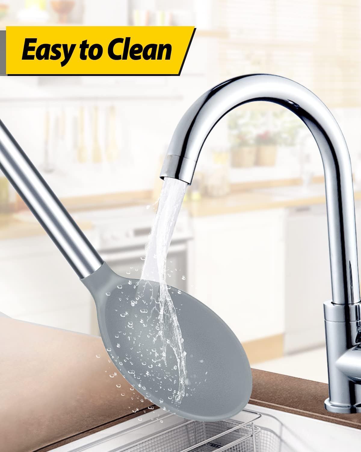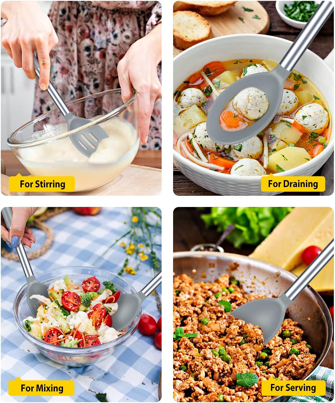 - Thoughtful Design : The good-quality 18/8 stainless steel keeps you away from the trouble of kitchen utensils rusting or breaking; This anti-scald silicone handle is not easy to conduct heat and is more comfortable to hold than traditional utensils