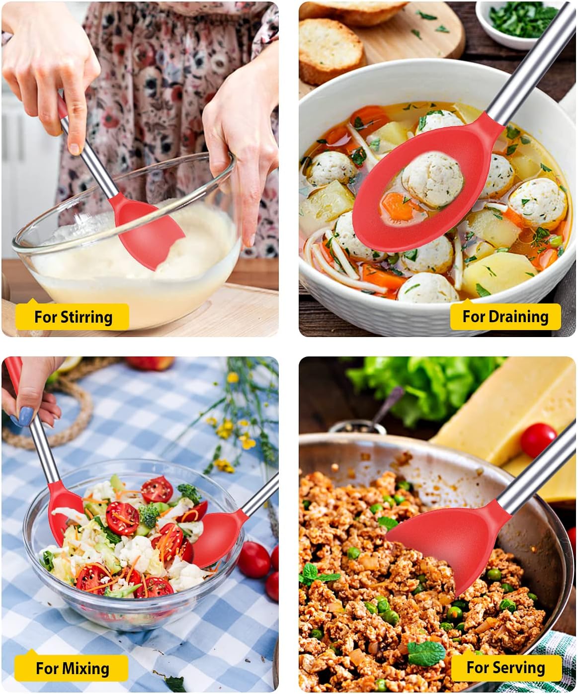- Just Want To Provide The Ideas For You : Large cooking spoon used to hold food more convenient; Slotted Spoon can quickly drain the water; Whether it is used for draining or serving food, our large silicone cooking spoon will add more fun to your kitchen