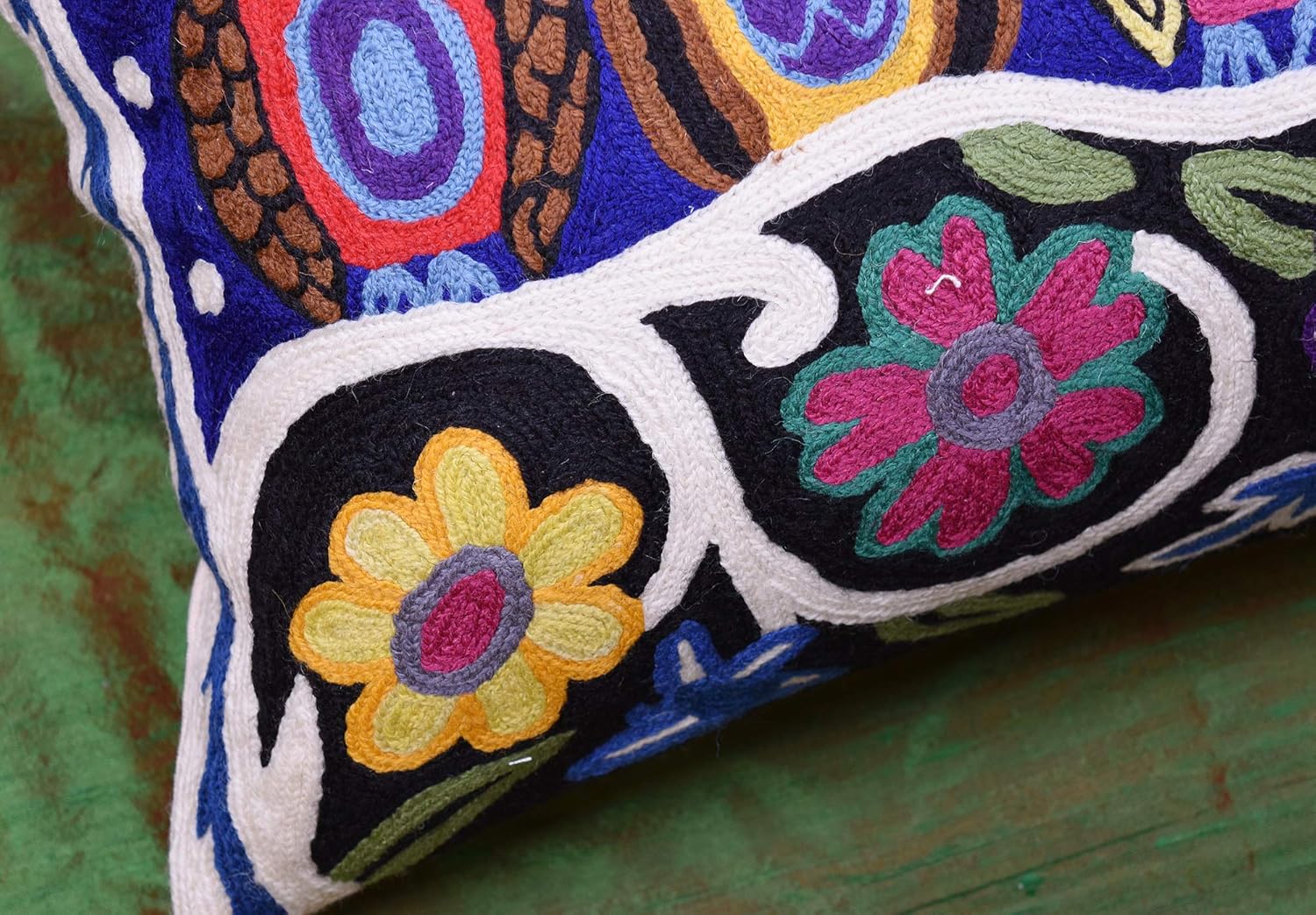 - Made of 100% Cotton Front and Back.100% Wool Embroidery on Front. Hand embroidered (Guaranteed) by the Finest Artisans in Village Cottage Units. This pillow cover is a work of art, hand crafted to perfection. No two are exactly alike.