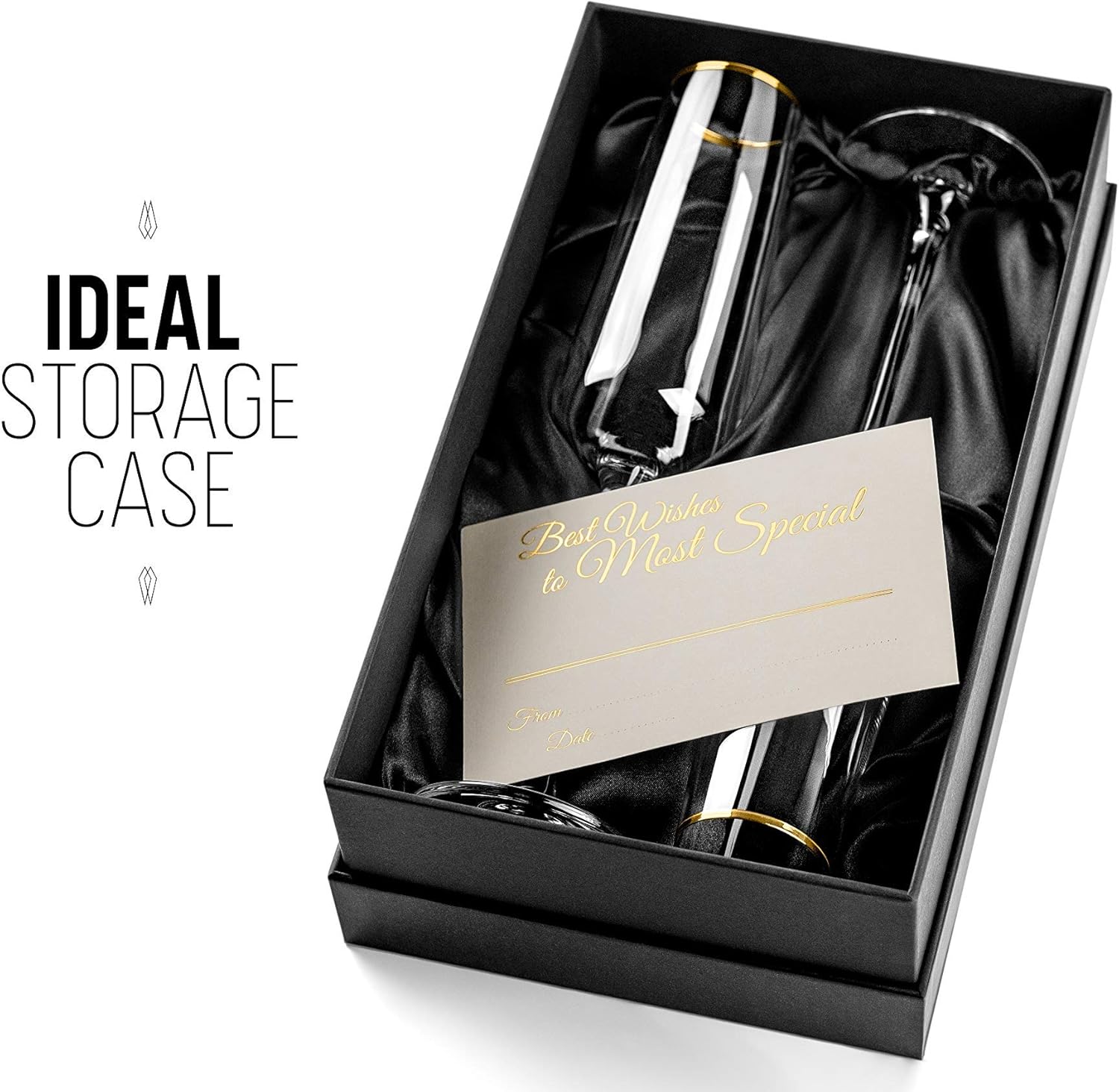 - ELEGANT GIFT BOX – every pair of two champagne glasses comes neatly packed in our signature chic gift and storage box with a gift card ready for gift giving. The back shares a few smart tips for choosing the best bottle of bubbly while the silky flute shape matching cloth carefully secures each glass in place to protect from dust, scratching and breaking.