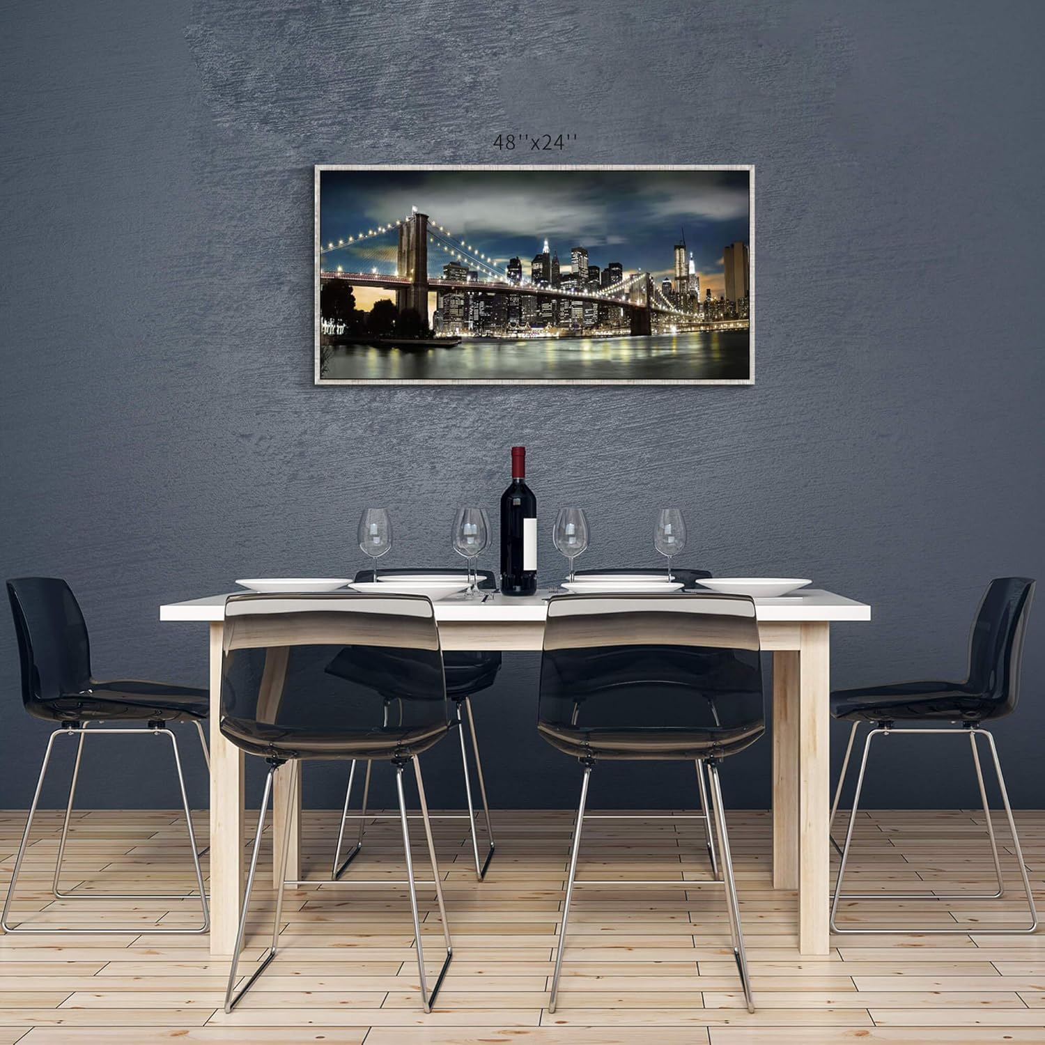 - New York Night Landscape View Wall Art: Modern new york city night view artwork. The famous brooklyn bridge located between Manhattan and brooklyn quietly, which is accompanied by the sky tall buildings and the dark reflection river. The scene is so beautiful and peaceful.