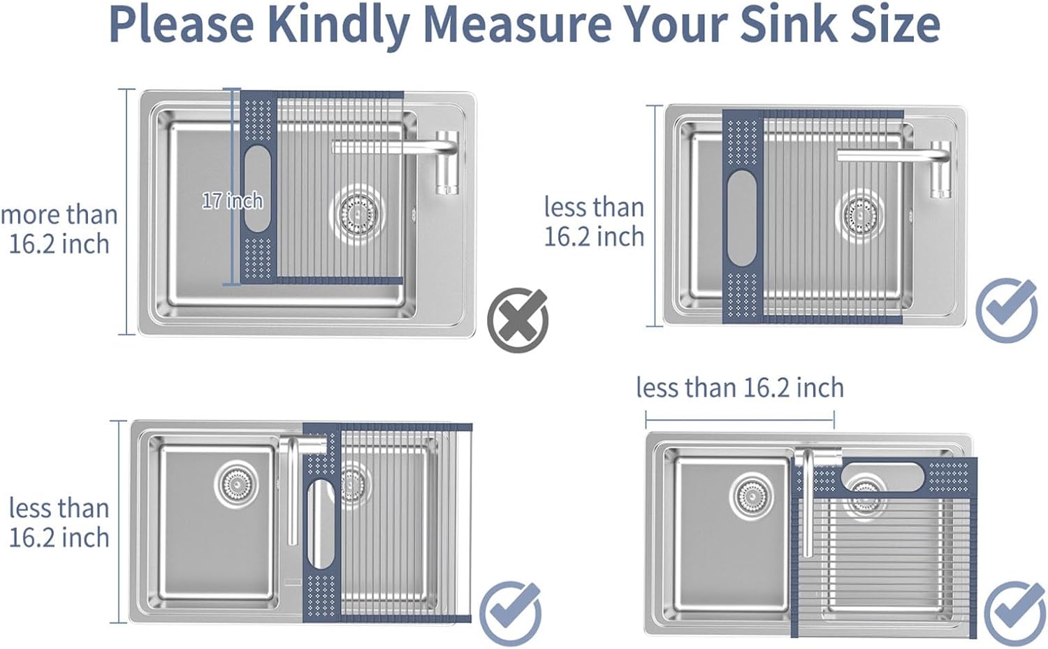 - OVER THE SINK DRYING RACK : This one is 17.5(L) x 15.2(W) inch, Recommended sink size: SHORTER than 16 inches. To Avoid Buying Inappropriate Size of this Drainer Rack, Please Firstly Measure the Size of Your Sink Before Purchasing. (NOTE: Only Drying Rack not including the silverware or dishes.)