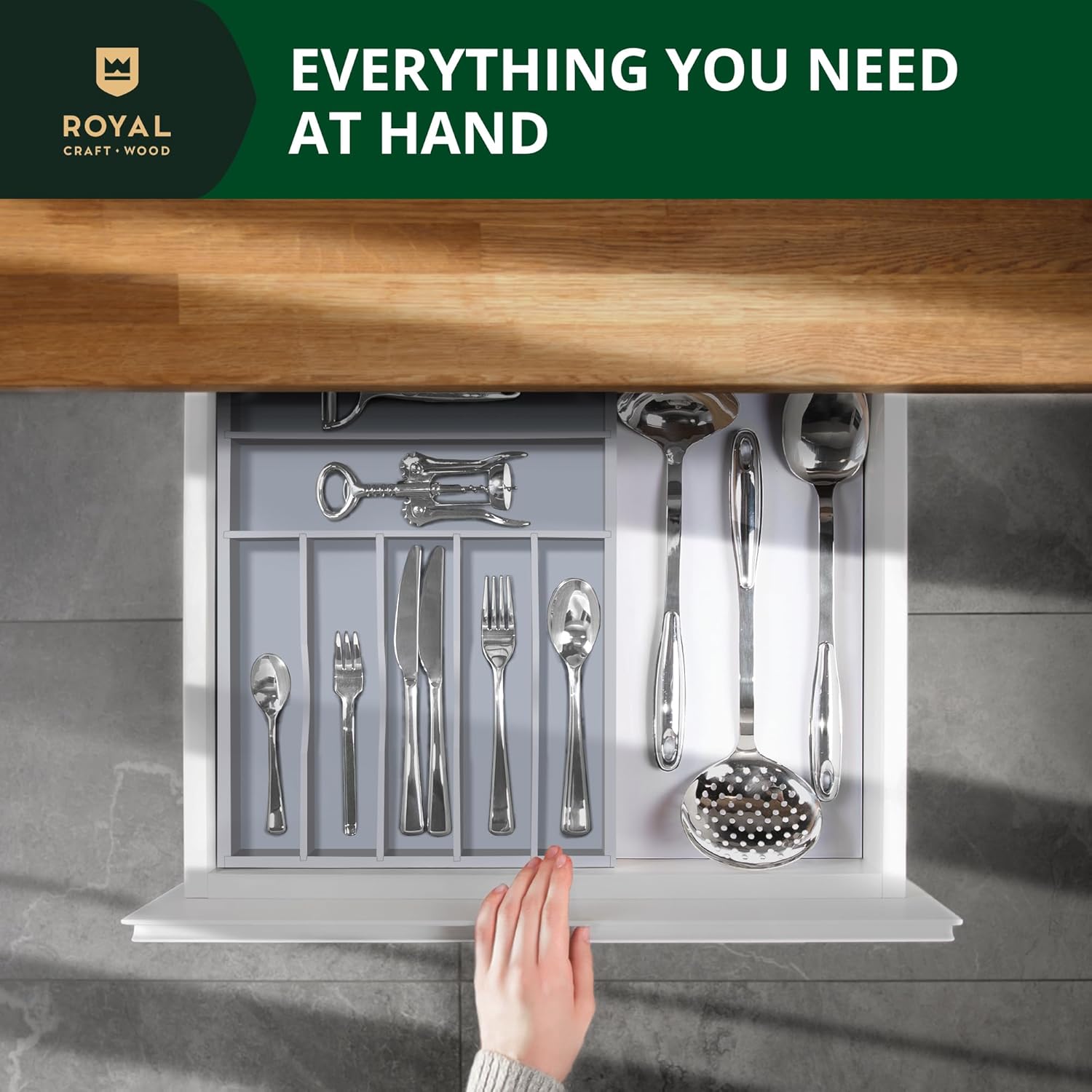 - π§½ππππ ππ πππ, πππ πππππππππππ: Super easy to use, simply set the Royal Craft Wood Cutlery Tray with Drawer Organizers in your clean, empty drawer and fill with anything youβd like from kitchen utensils such as spoons, forks, tongs, spatulas, or steak knives to desk essentials like your stapler and staple refills, paper clips, erasers, and more. Easy to maintain, all you need to do is wipe clean with just a damp cloth, and your silverware drawer organizer will be as good as new