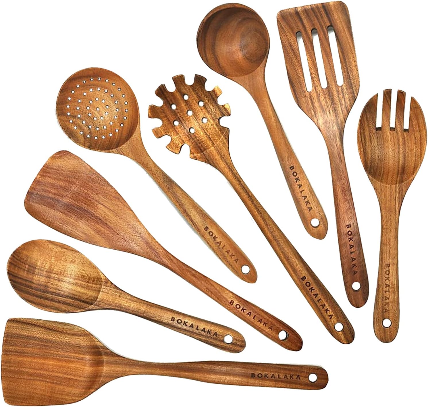 - đOur Wooden Cooking Utensil Set Advantage: <br /> â˛Made of natural teak, naturally lightweight, beautiful contour, non-toxic, tasteless, safe and healthy, Rugged and not easy to crack. <br /> â˛They been polished many times to make the surface smooth. The exquisite craftsmanship makes you not in our wooden kitchen utensil set found in any dents, small gaps or debris. <br /> â˛The natural pattern makes the tableware look unique and artistic, allowing you to experience the breath of nature ,and it is a great choice as a gift. <br /> ⲠLong and comfortable handles make these cooking spoons easy to hold when stirring food for a long time and protect your hands from the heat. <br /> â˛Tronger heat resistance, will not crack due to high temperature, and will not melt due to high temperature like rubber tableware.<br /> â˛Each handle features a hanging hole for easy storage and easy for taking. <br /><br /> đSpecifications <br /> â˛Wok Spatula: 13.5x 3.3 inch <br /> â˛Frying Spatula: 12.6 x 2.9 inch <br /> â˛Slotted Shovel: 12 x 2.9 inch <br /> â˛Soup Ladle: 11 x 2.9 inch <br /> â˛Spaghetti Spoon: 12.6 x 3.3 inch <br /> â˛Strainer Spoon: 11.2 x 3.1 inch <br /> â˛Salad Fork: 10.2 x 2.8 inch <br /> â˛Mixing Spoon: 10.5 x 2.8 inch <br /><br /> đLet You Stay With Your Family:<br /> It is a great choice of sending mom, women, and chefs for a activity, birthday, Christmas and more special occasions.Our wooden utensils set is suitable for using in every kitchen.Whenever they cook in the kitchen,your family and friends can think of you that this is the best happiness things.Itâs time to prepare a set for them so that you can be by their side every day.What are you waiting for? Add to cart and join the BOKALAKA big family today!<br /><br /> Keywords:Wooden Kitchen Utensil Set Wooden Cooking Utensils Wooden Spoons for Cooking Wooden Spatulas for Nonstick Cookware Wooden utensils for cooking