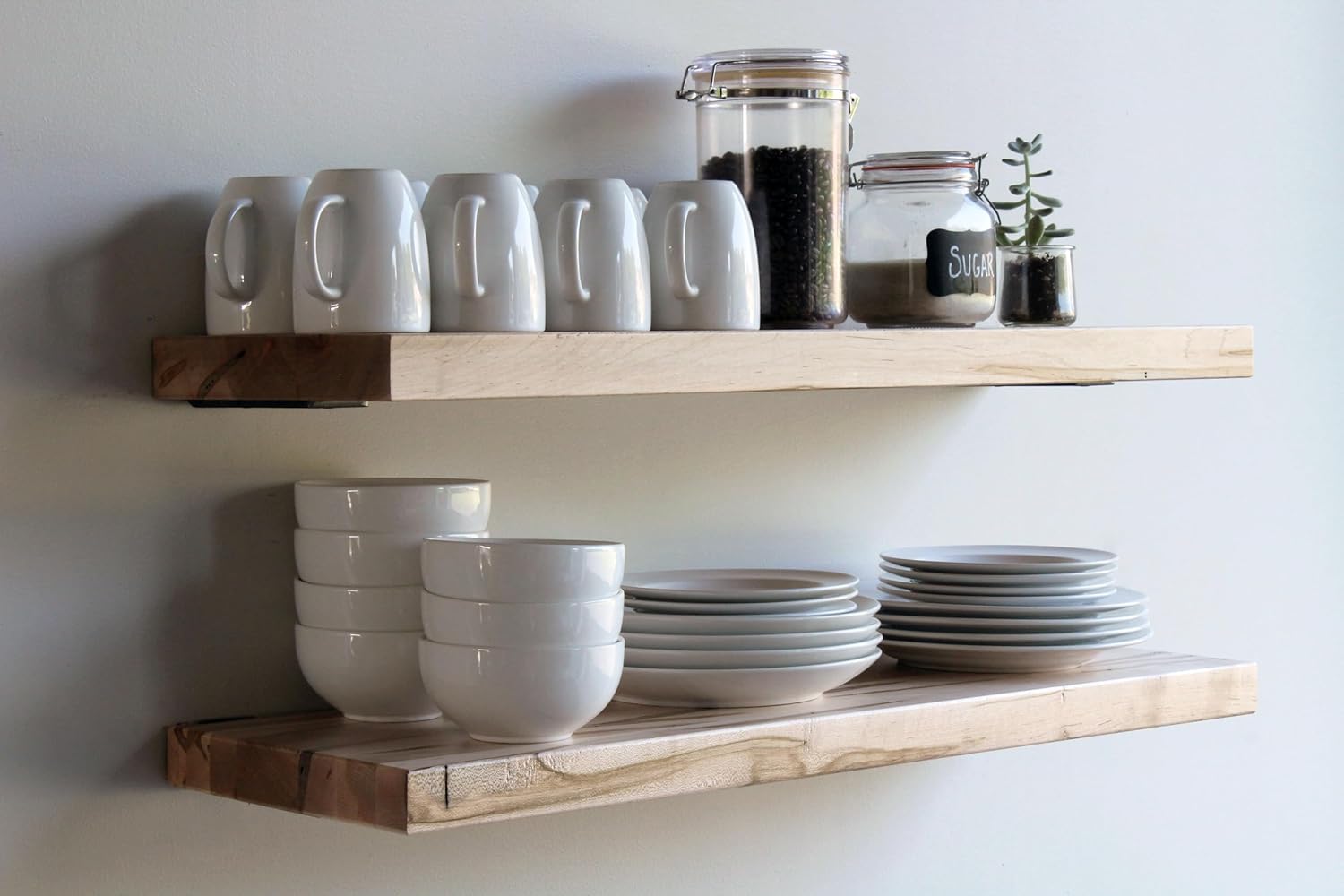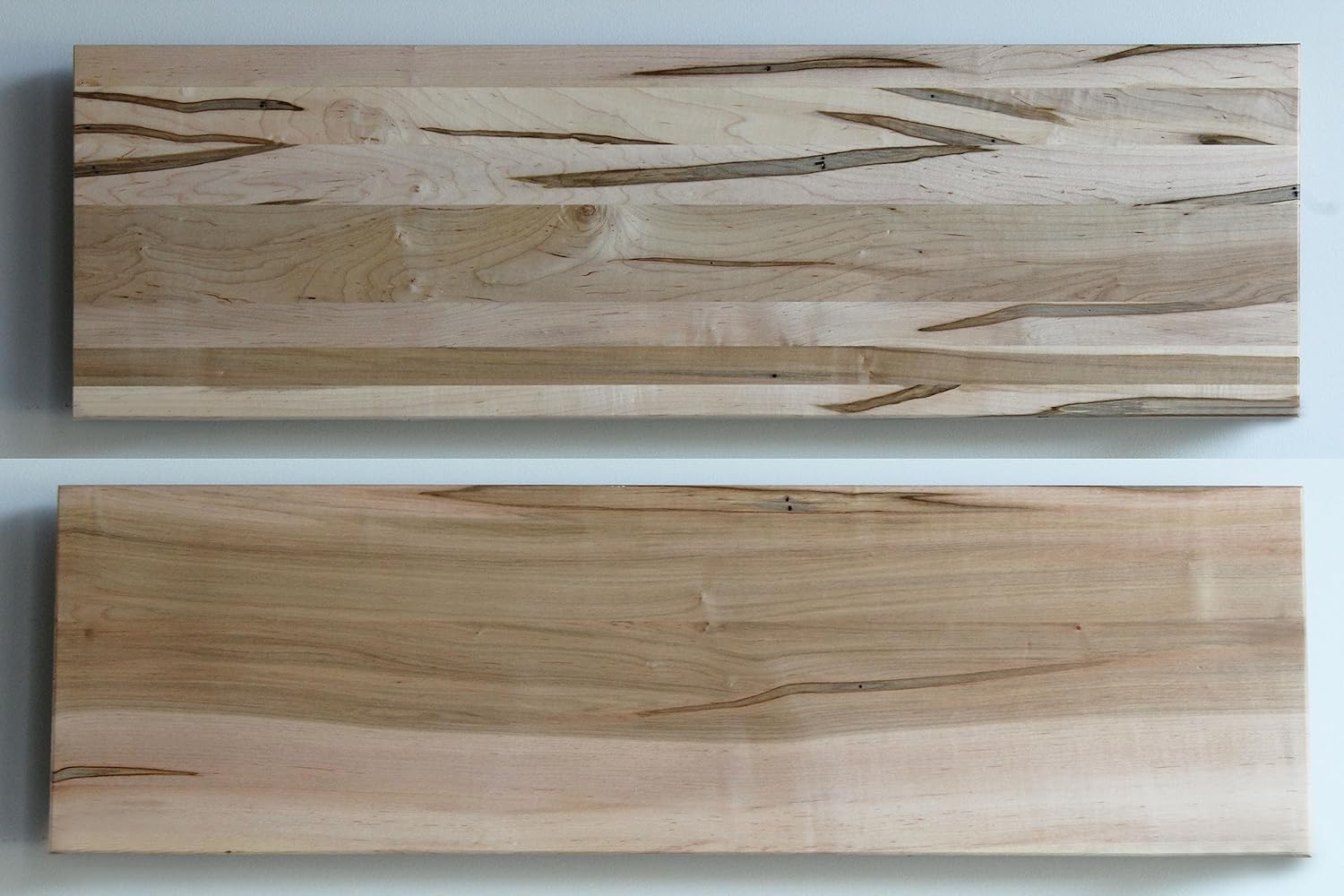 - Set of 2 Deep Floating Shelves, Wormy Maple with Furniture Grade Clear Coat Finish. Each shelf measures 48" x 11" x 2" (nominal) and can support up to 100 lbs.