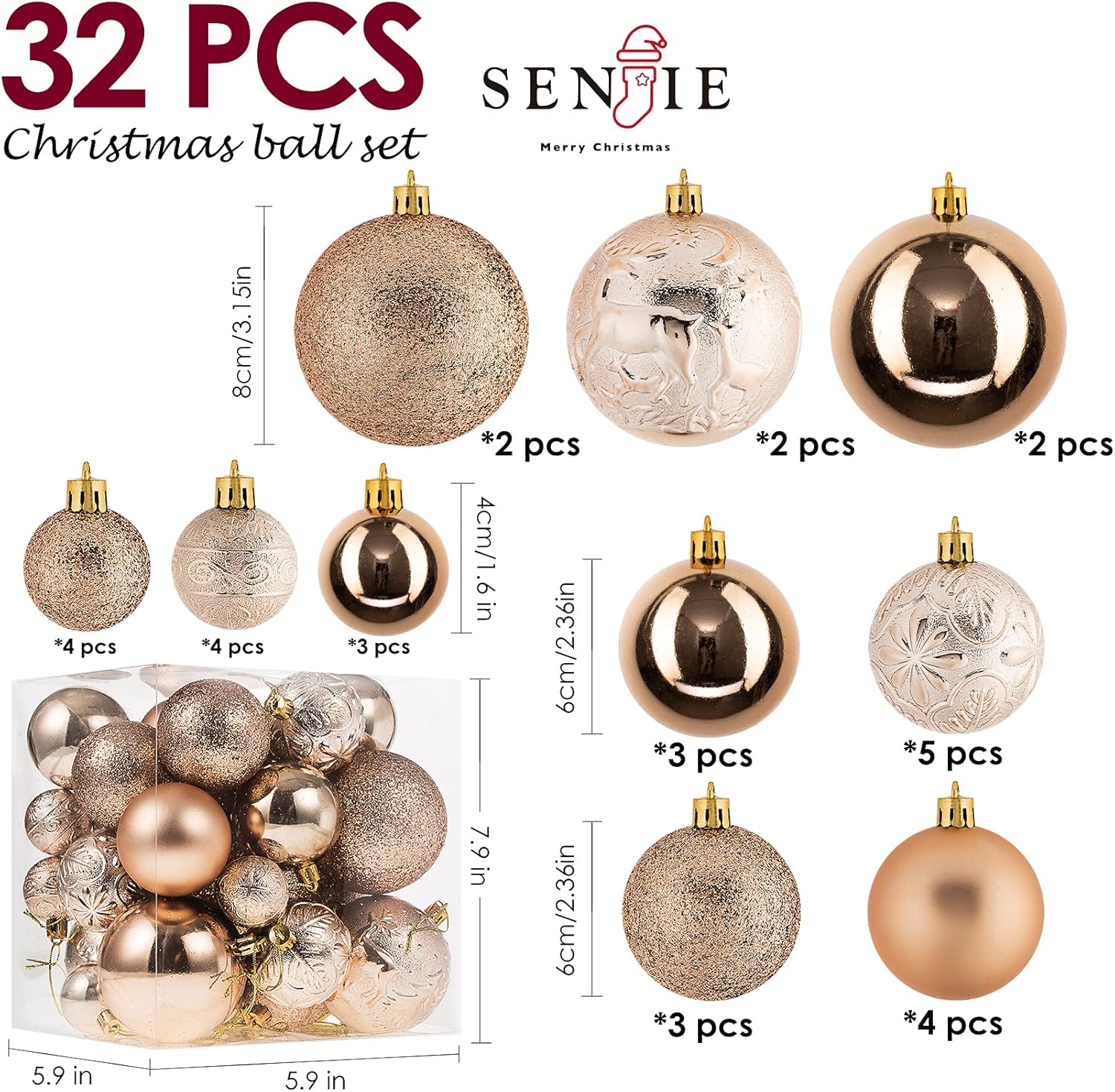 - ADD TOUCH TO YOUR TREE:Different textures making it easy to create a multidimensional look.Surfaces of ball:Spiral(4),Glitter plated(9),Shiny(8),Matte(4) and Christmas(2).