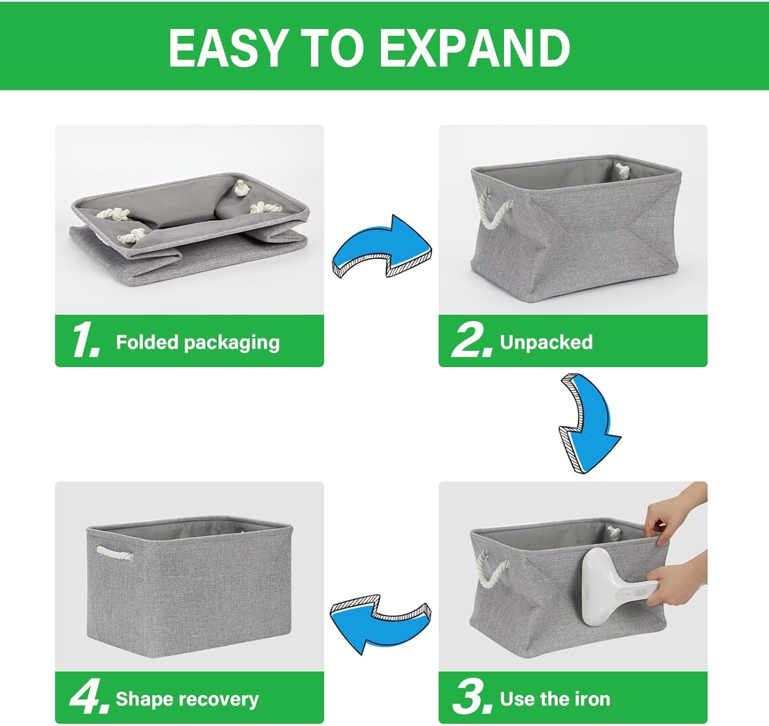 - Collapsible Baskets Set: Simply fold the canvas basket down flat for space-saving storage when not in use or when needing to transport. We shipped them in a folded package, if it doesn't stand up very well when you receive it, you can fill the large basket with clothes or blankets, it will recover gradually. If you want the basket to stand up quickly, you can use an iron to iron out the creases