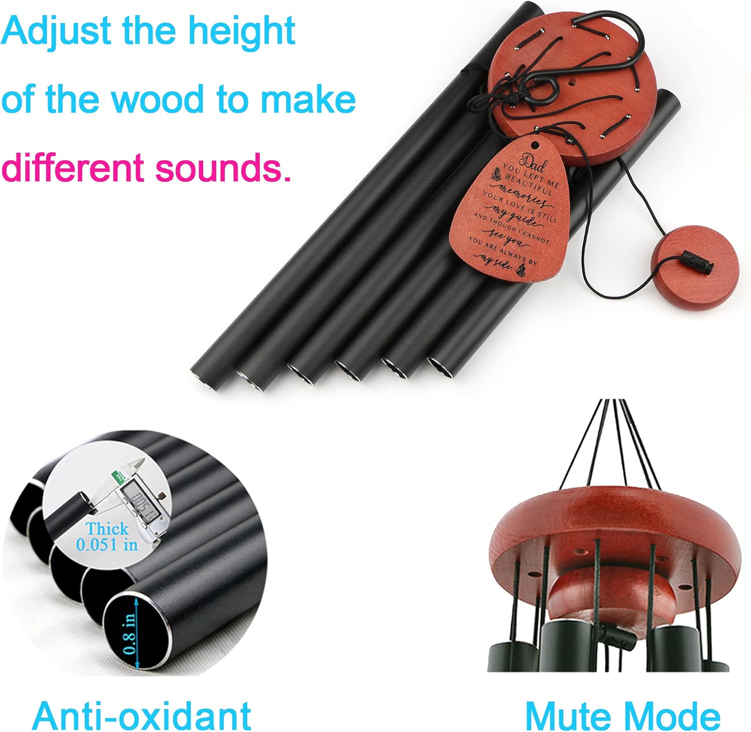 - Premium Quality Memorial Wind Chimes: Made with high-quality aluminum tubes and a corrosion-resistant black anodized finish, these memorial wind chimes produce clear, beautiful tones. The bell holder, striker, and wind catcher are made from durable beech wood, and the entire structure is supported by a strong, weather-resistant nylon cord for lasting outdoor use