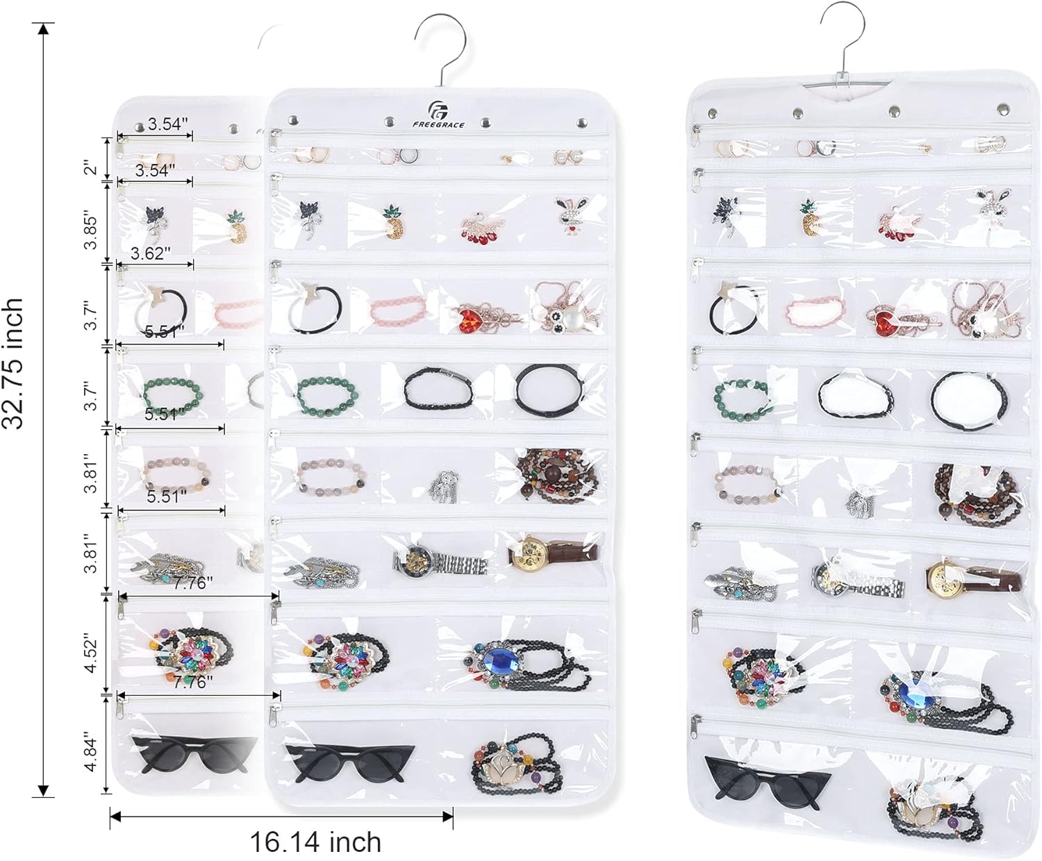 - QUALITY MATERIALS: Freegraceโs sturdy hanging jewelry organizer is made of 600D polyester Oxford fabric and has a PU backing (SIZE: 32.7โโ x 16.5โโ). The pockets are made of transparent PVC to allow you to see through to the stored jewelry, and the zipper and revolving metal hanger are well-made and durable.