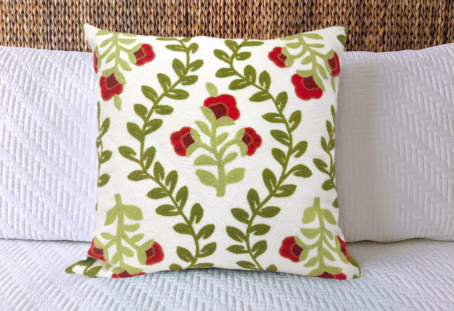 Alysheer Floral Embroidered Summer Decorative Throw Pillow Cover 18"x 18", Farmhouse Cottage Red Flowers Green Leaves Knit Pattern Cotton Canvas Cushion Case for Sofa Couch Bed Living Room Decor