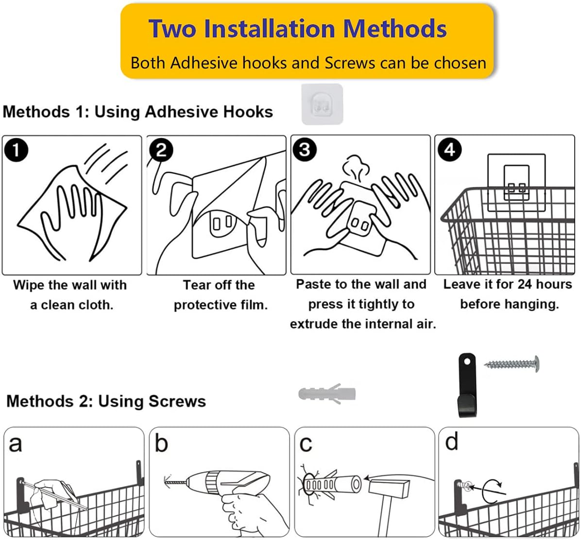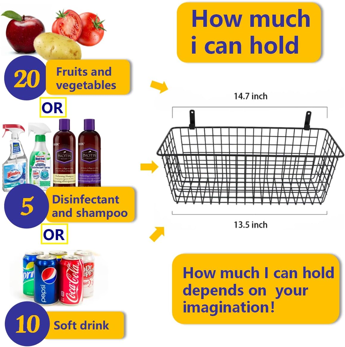 - 🍎【Sturdy wire baskets that can hold 50 pounds】 These baskets are made of durable steel wire with durable anti-rust and anti-corrosion coating, as well as wall-mounted hardware and hooks, which can hold 50 pounds. (Note: If you use non-marking paste instead of screws, the basket can hold 11 pounds)