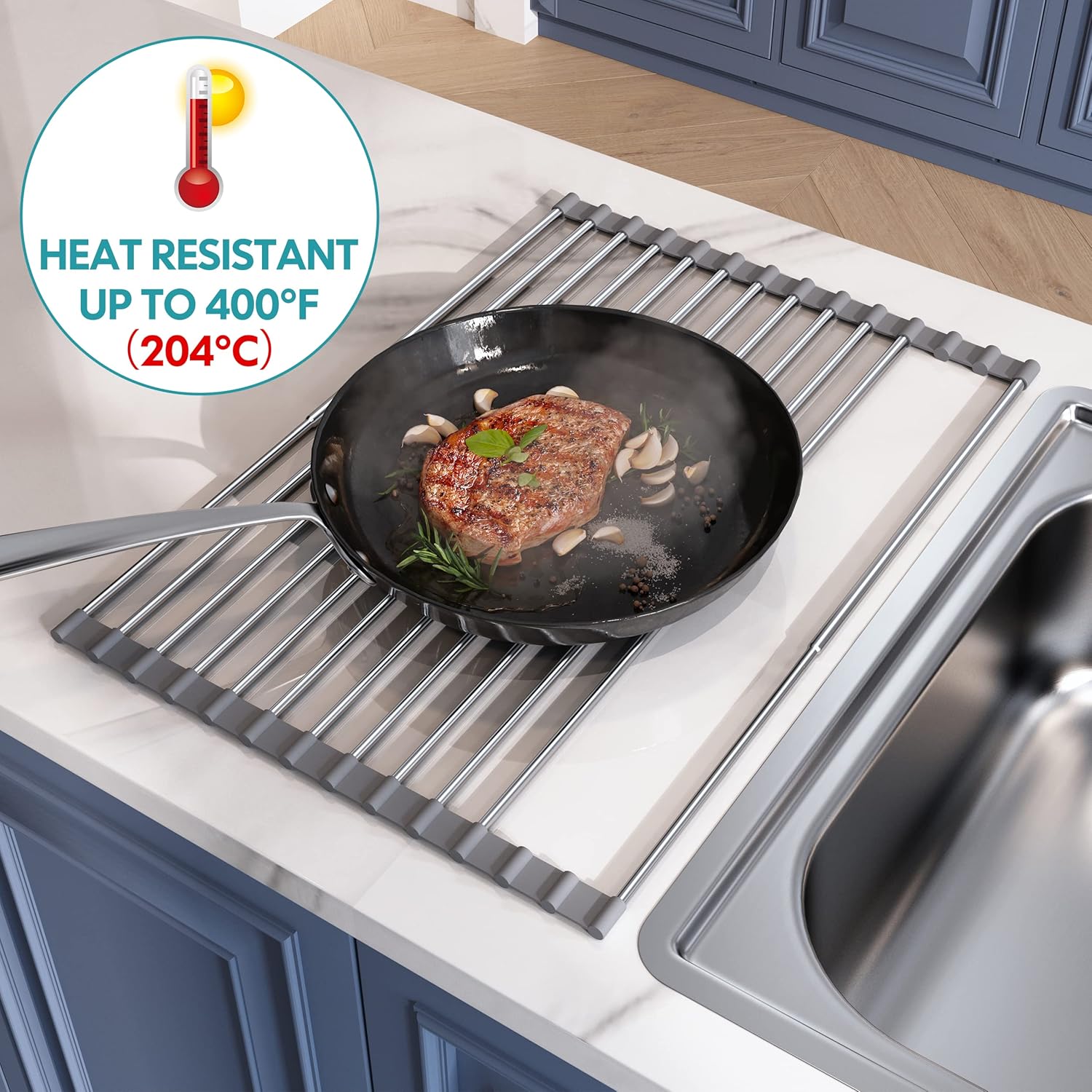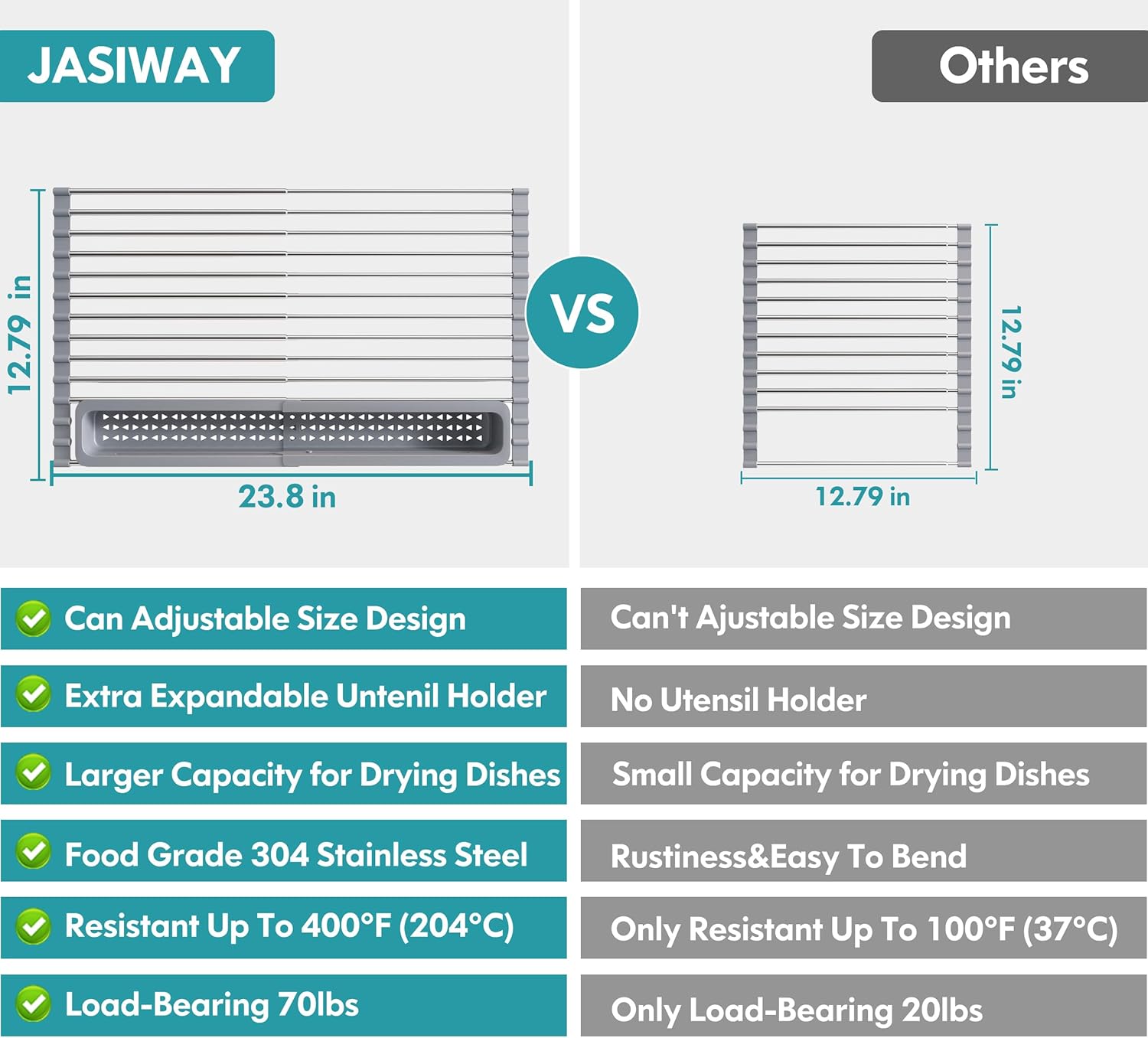 - Space Saving & Easy to Store: This expandable dish drying rack is using on the sink, which doesn't take up your usual counter space, and the water will drip directly into the sink. The drying rack for kitchen sink can easily rolled up for storage when it is not in use, leaving the sinks and kitchen counter keep neat and organized. This over the sin drying rack will be the best parter in the kitchen organization and storage!