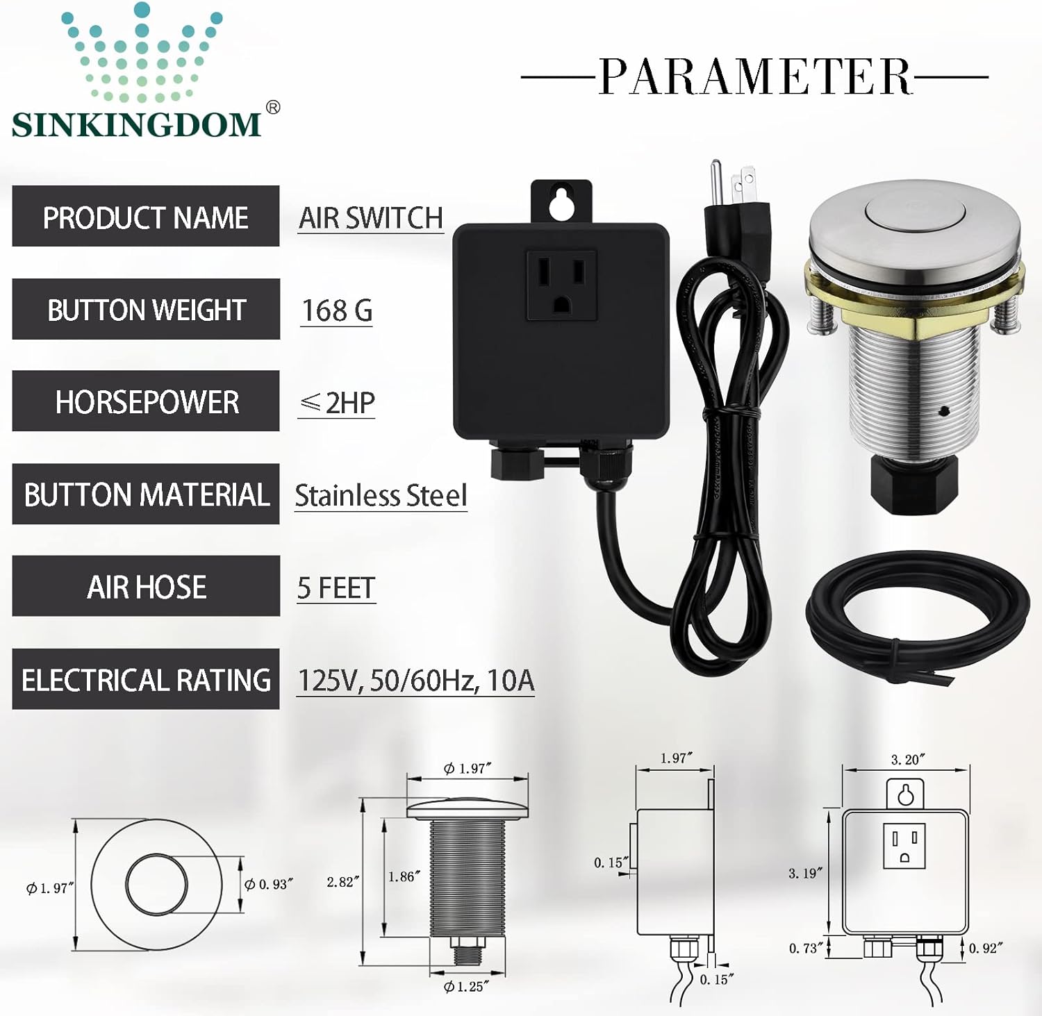 - Digital: 3.20"x 3.19"x 1.97" Power Adapter, 60.00"/1.5M Air Tube and 40.00" Power Cable, 2.95"x 1.25" Air Switch Adapter Button, 1-3/8"Countertop Hole, 2HP, UL Certification.