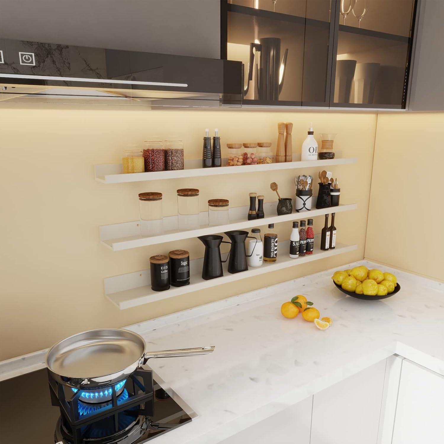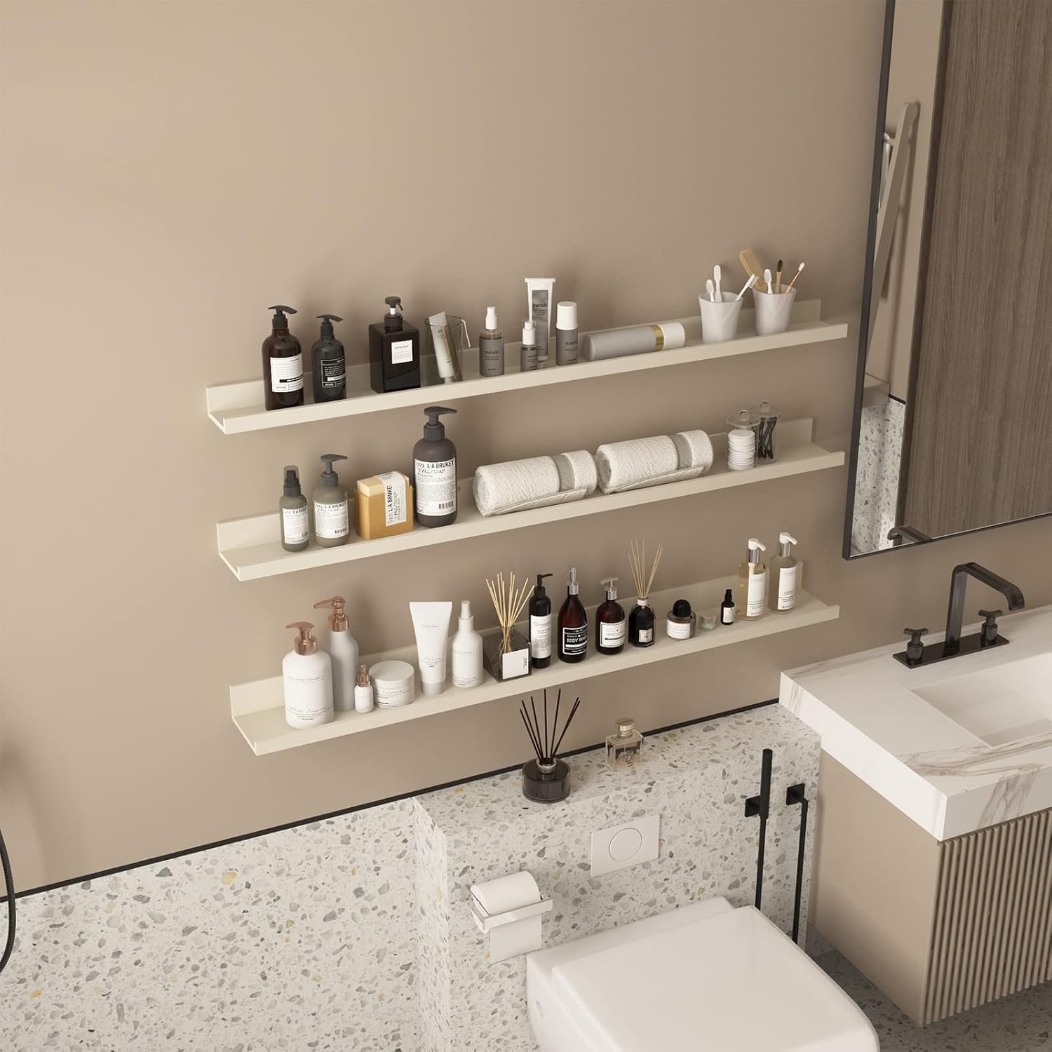 - Multi-size Shelf Set: The pack of 3 47-inch wall-mounted shelves with different widths and depths, Large: 47.24 x 5.51 x 2.67 inches, Medium: 47.24 x 4.68 x 2.32 inches, Small: 47.24 x 3.85 x 1.96 inches. These wall shelves provide ample storage space for storage and display, such as pictures, kids books and toys, plants, decorations, jars and more. (PLS NOTE: It is not pure white, it is more of a beige or light grayish woodgrain white, but it is still chic )