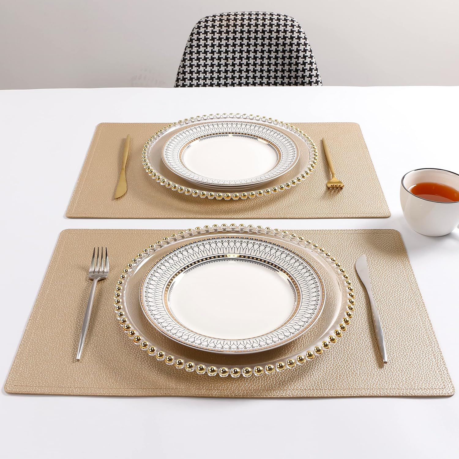Set of 6 Faux Leather Placemats, PU Table Mats, Waterproof, Stain Resistant, Heat Resistant, Easy to Clean for Kitchen Dining Table,Conference Table C Gold Rectangle