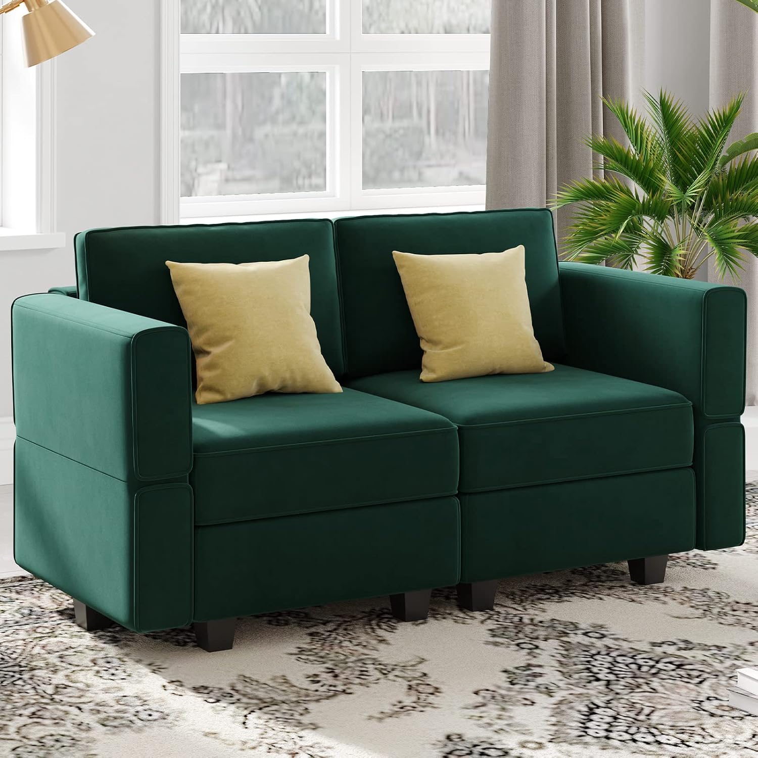 - Velvet Fabric: This modular loveseat sofa is made of soft and breathable velvet fabric, which is skin-friendly. The Luxurious velvet and premium foam create a gorgeous atmosphere. When you touch the fabric, the feeling of comfort and relaxation come to your heart.